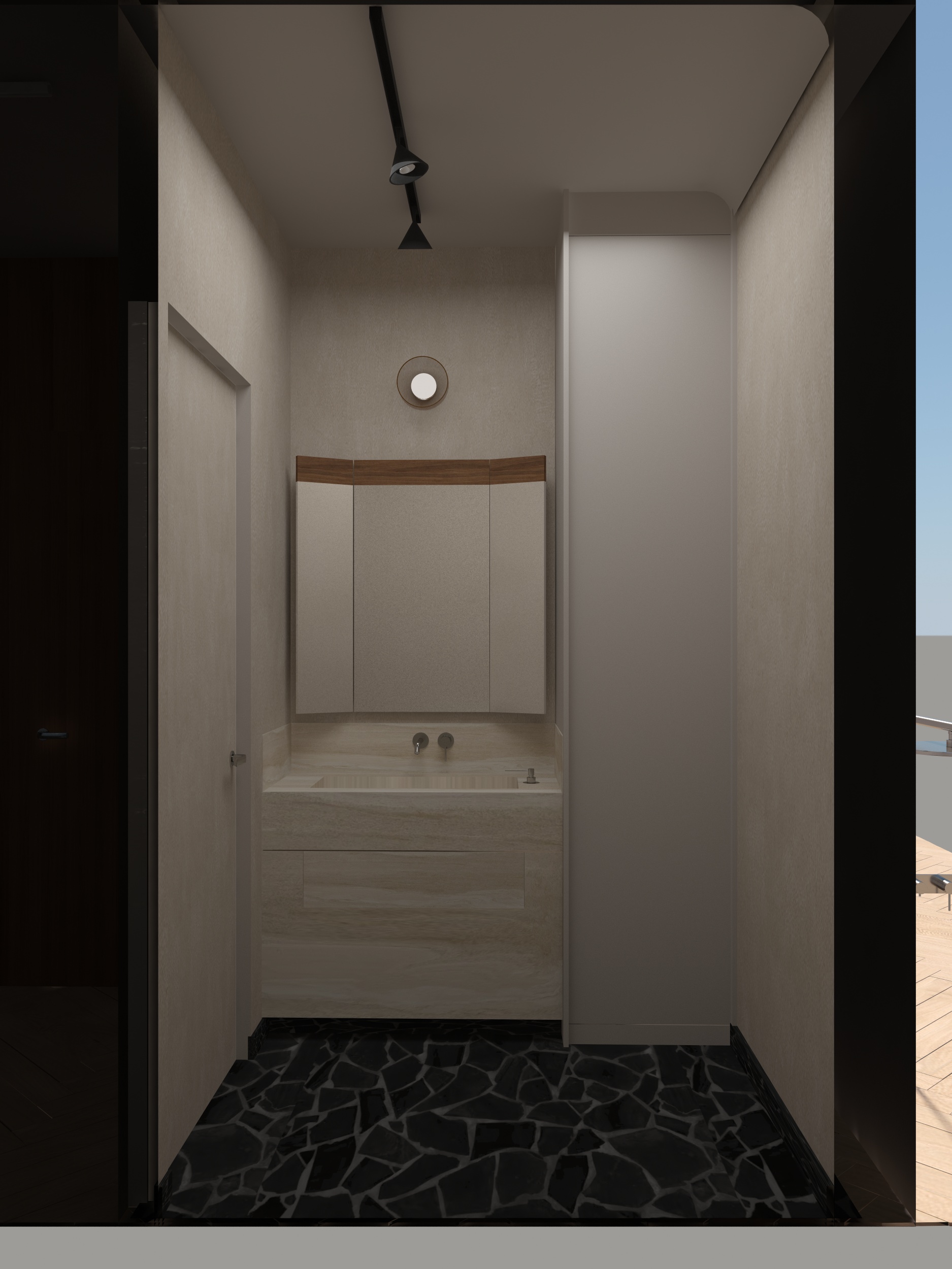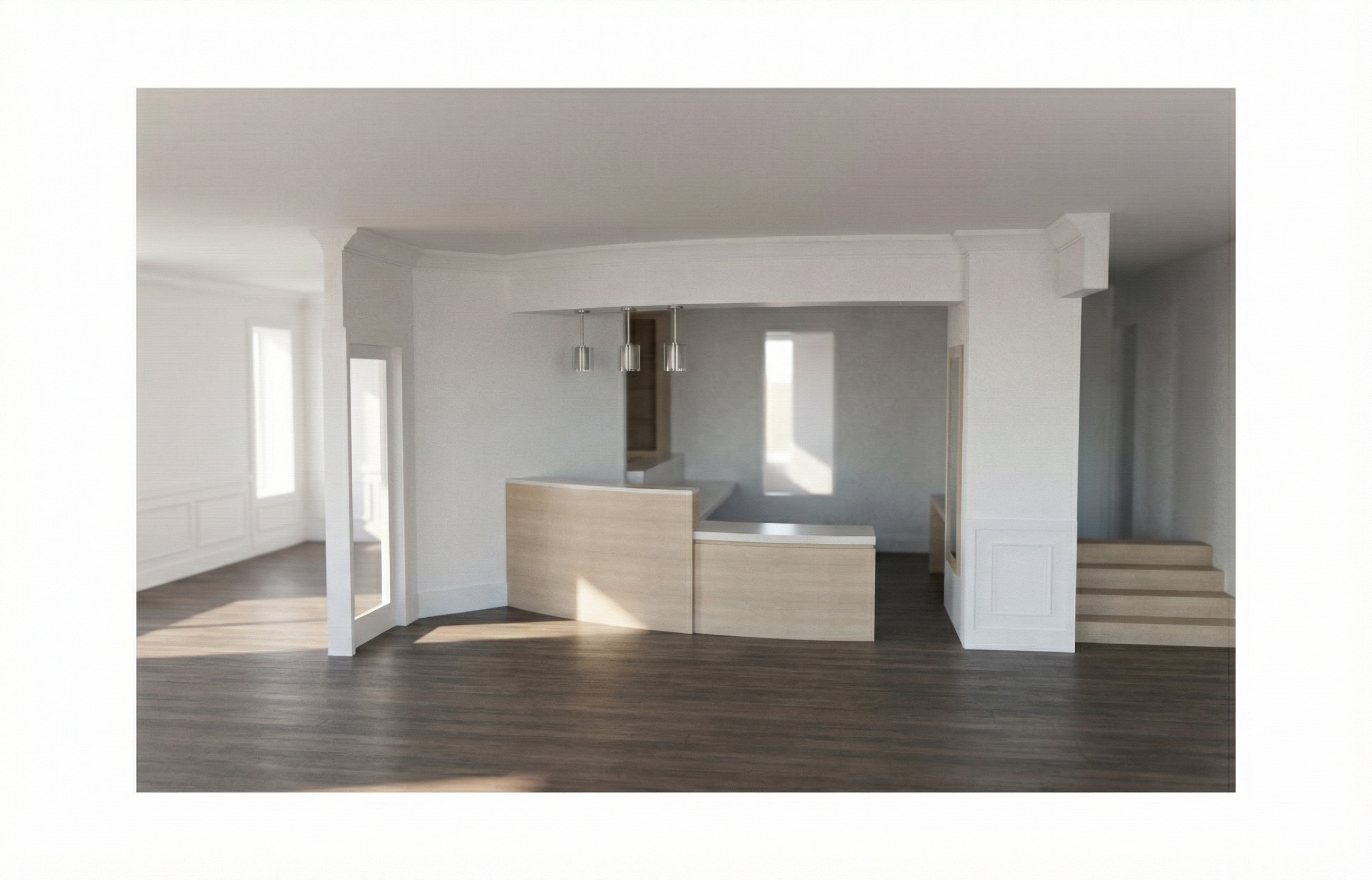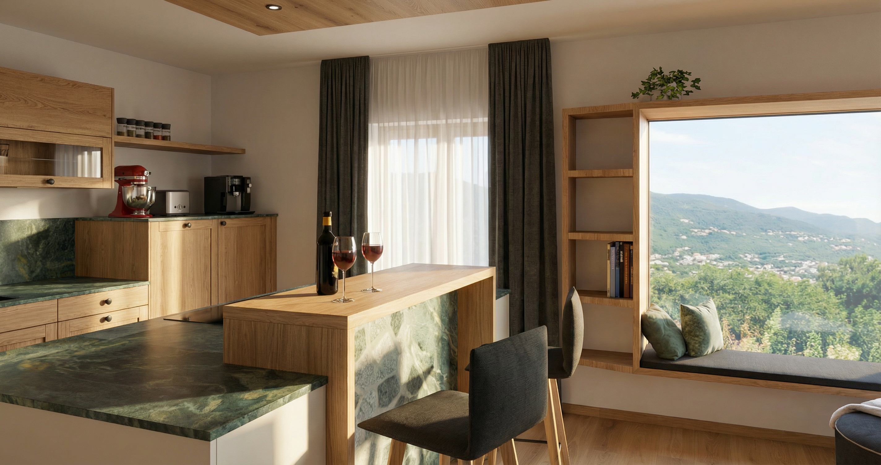 transform this 3d view into a high end photorealistic architectural render add a little natural sunlight entering from the windows creating soft shadows and realistic light bounce but keep the whole image light and not too warm office vibe with a little domestic atmosphere outside show a modern terrace with landscaped garden make the view naturally blurred improve all material textures to look realistic and high resolution the wall on the right side those are wood wool acoustic panels light natural wood tone fibrous texture slightly rough and porous surface on the left side there is a glass cubical behind it there are two pot plants standing on the floor behind them there is an additional desk enhance material detail realistic reflections global illumination and natural color balance keep the original geometry and camera angle unchanged