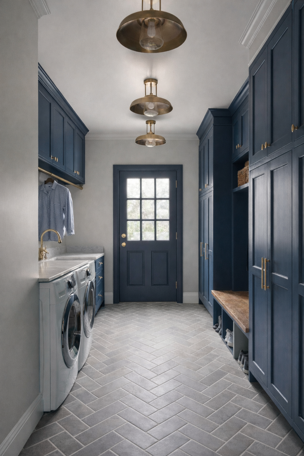 edit the laundry room shown with the following directives paint the entire room including the cabinets a midtone greenish gray like sherwin williams evergreen fog remove the open shelf near the top of the dropzone on the right wall leave the ceiling white remove the decorative lights from the ceiling