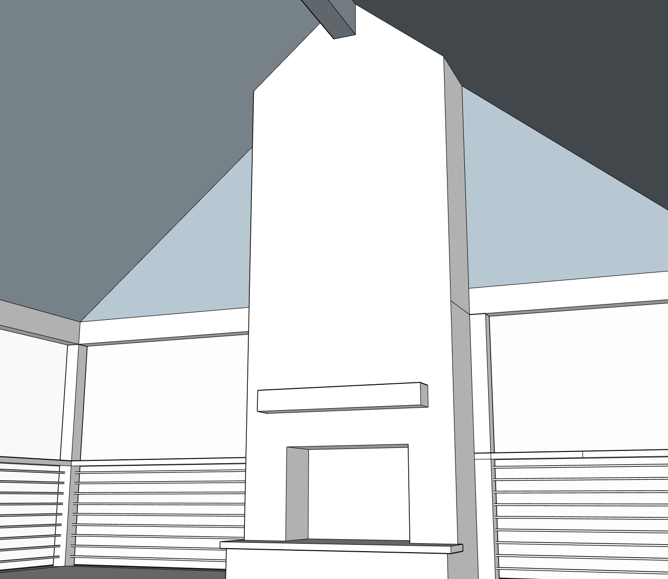 screened in porch stone fireplace with rustic wood mantle tv above mantle vaulted wood ceiling with beam gable wall is closed in and not open up top