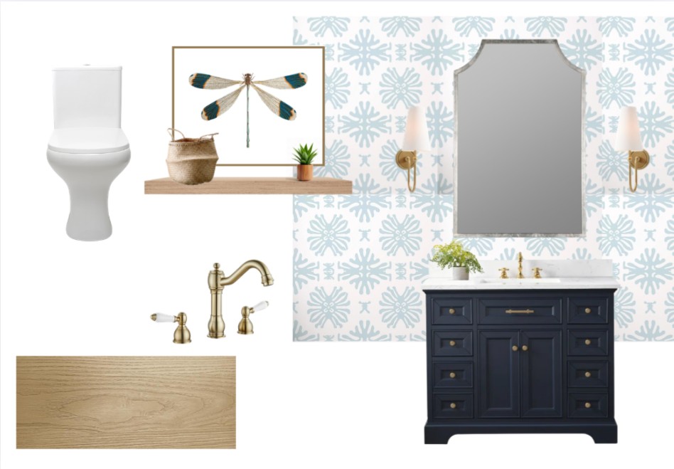 use the selections shown to render a small powder room wallpaper all walls and paint the baseboard and crown to match the blue of the wallpaper place the sconce on the left and right wall on either side of the vanity add a decorative cut to the backsplash on the vanity the floors are hardwood