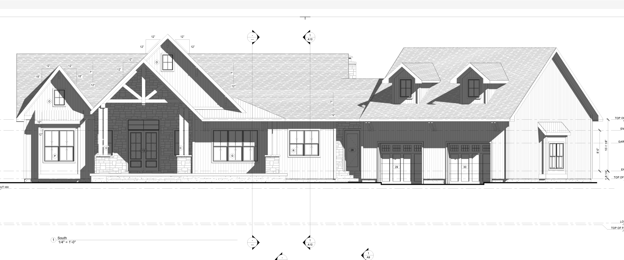 siding is a cream white stone is tan windows are dark putty roof is dark brown garage doors and front door and pillars are medium brown wood bumpouts on left and right side of house are dark bronze with no stone