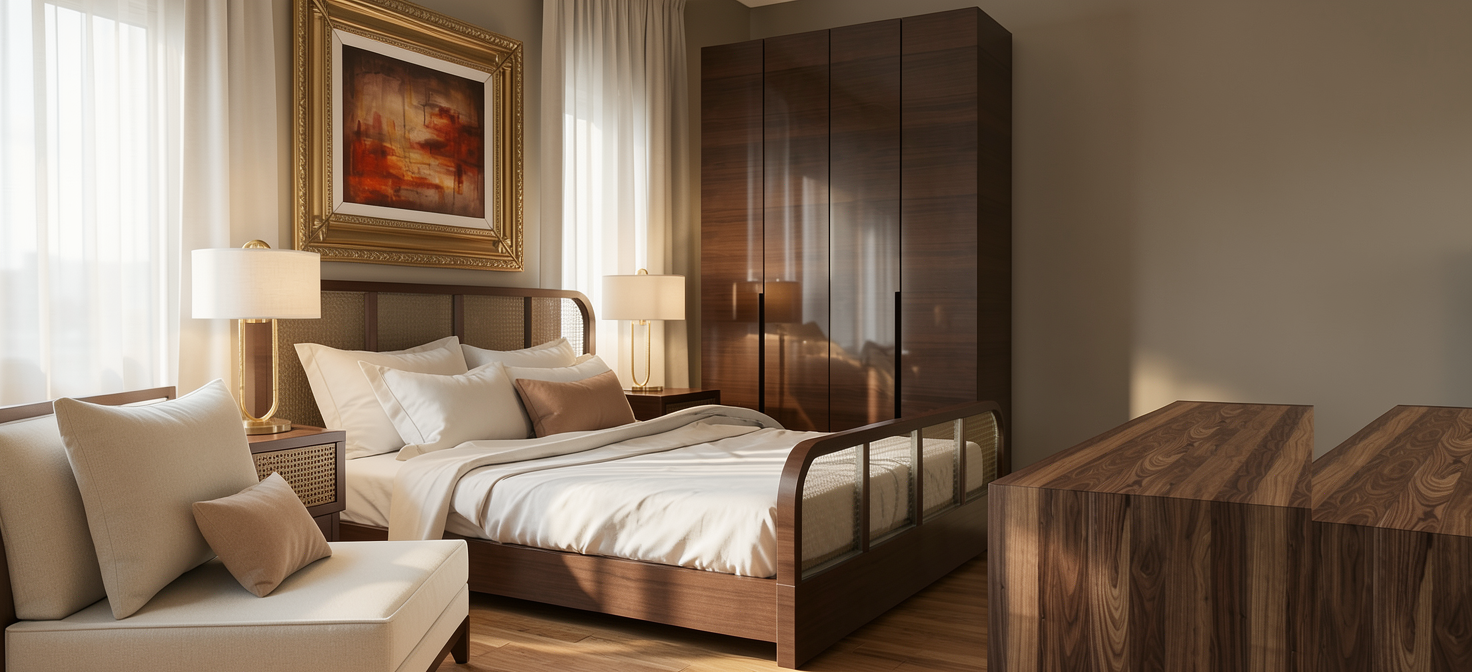 enhance the scene by adding a led strip along the top of the stone wall and pour wine into the wine glasses on the countertop keep the arrangement natural and maintain the room s minimalist bright atmosphere