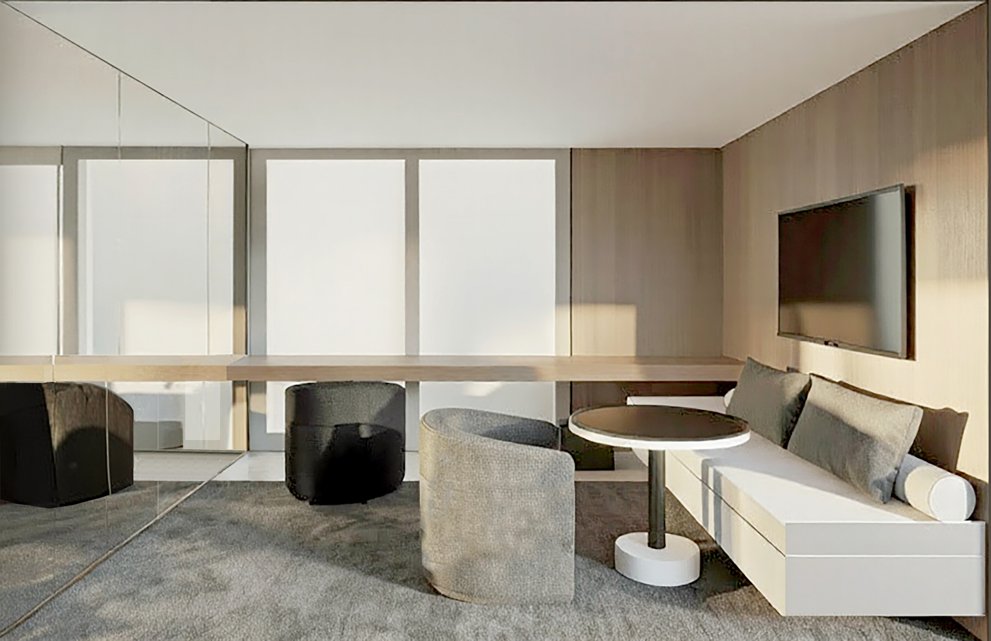 light rift cut oak walls with no striping or grain windows have sheer roller shades smooth gray wool carpet do not modify lighting