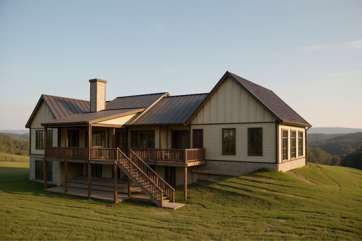 render a serene coastal style house perched elegantly on stilts the house exterior is painted in a soft sandy beige reflecting the warmth of a beach environment the gabled roof is a light slate gray complementing the coastal atmosphere the large deck wraps around the house crafted from rich weathered wood in a deep walnut brown blue gray accents decorate the window shutters and trim adding a classic touch the backdrop features a pastel blue sky with soft wispy clouds creating a peaceful airy atmosphere the overall mood is calm and inviting embodying a tranquil coastal retreat