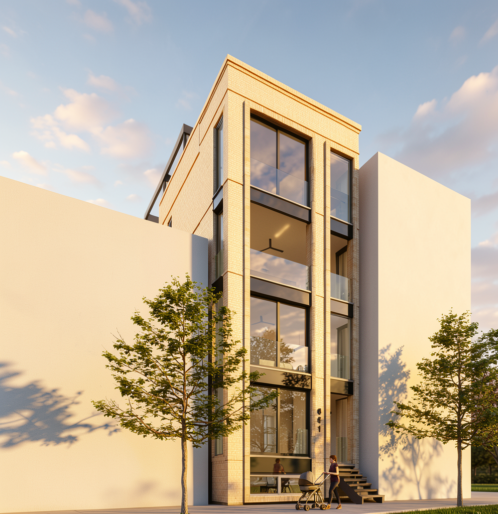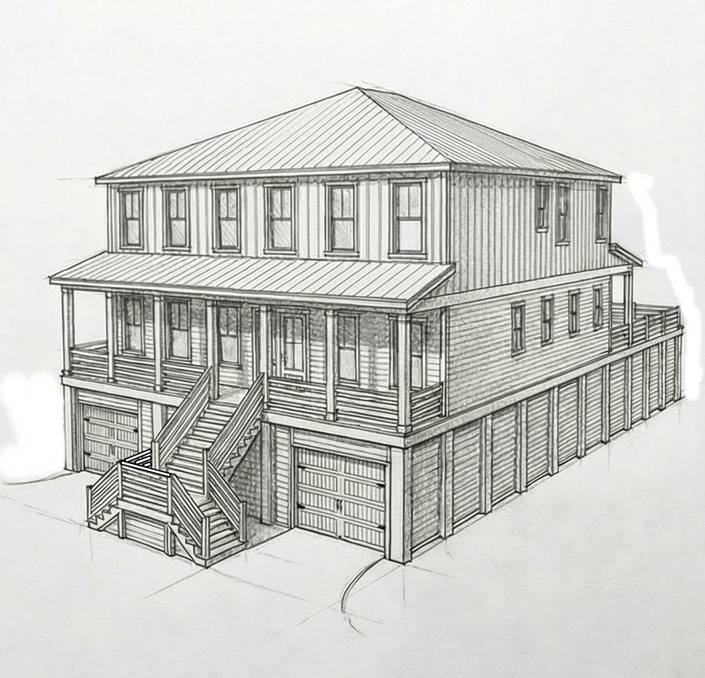 the house should have a white exterior with a silver metal roof and palm trees should be placed so that they do not overly block the view make a driveway for the garage