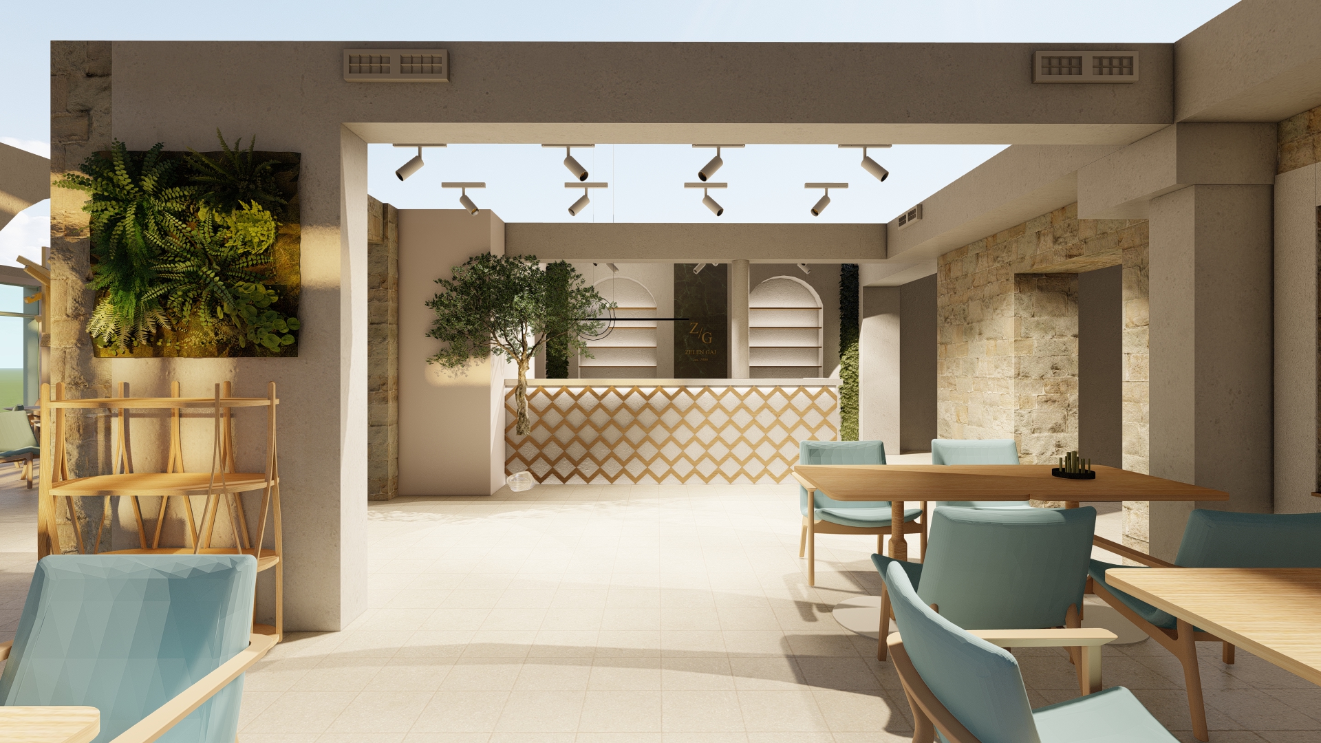 napravi realisticni prikaz dodaj zelenilo i tih mediteranske konobe neka stolice budu tamno zelene ne mijenjaj materijale ili raspored prostorije pobolj aj osvjetljenje neka su tu padaju e biljke sa stropa dodaj detalje i boce vina na svim policama architecture