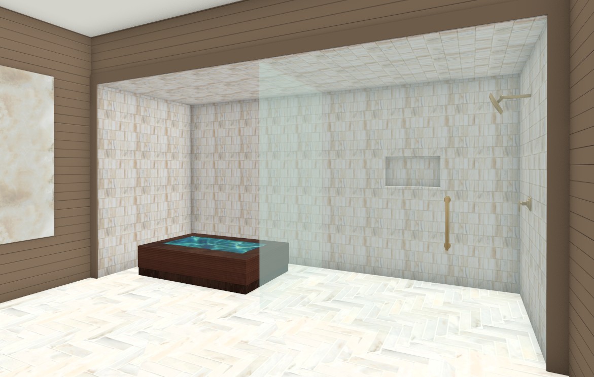 luxury home spa room with cold plunge pool with reeded walnut edges glass enclosed shower on right side brass fixtures horizontal walnut slats on walls soft luxurious lighting add some spa decor details herringbone marble flooring wall is mosiac marble as shown in picture backlit onyx slab art x1 on far edge wall on left side one niche in shower on right side no grab bars on walls no niche by cold plunge