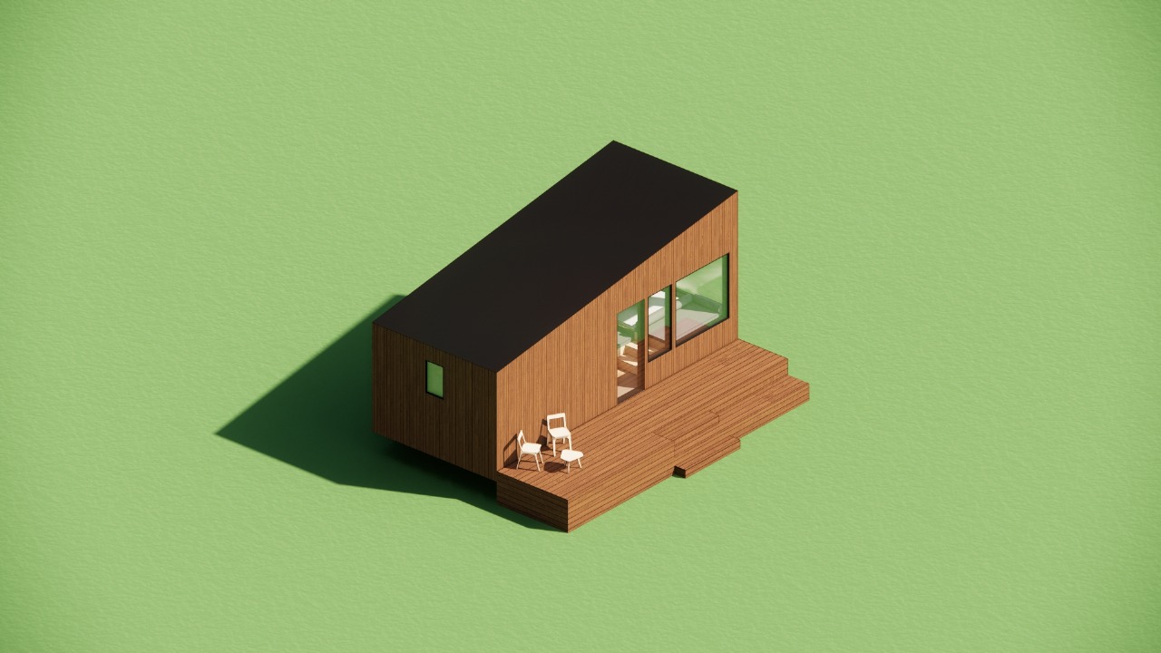 minimalism exterior shot a modern minimalist tiny house with a wooden texture featuring a slanted black roof the exterior is clad in warm dark brown wood panels the structure sits on a dark brown wooden deck holding two white chairs for relaxation large glass doors open to reveal a glimpse of a cozy interior the scene is set on a textured light green landscape with soft natural lighting creating a serene and peaceful atmosphere architecture