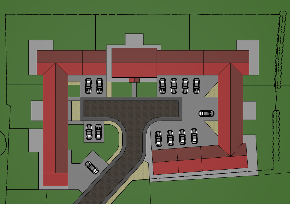 artistic watercolour layout architectural design from a top down view use a palette of soft reds roof tiles for the buildings and incorporate deep green for the natural elements such as surrounding trees and grass add a subtle texture to the parking spaces in a muted asphalt gray populate the parking area with cars in shades of silver and black for contrast the atmosphere should be serene and professional with a touch of luxury maintain shapes and lines of buildings