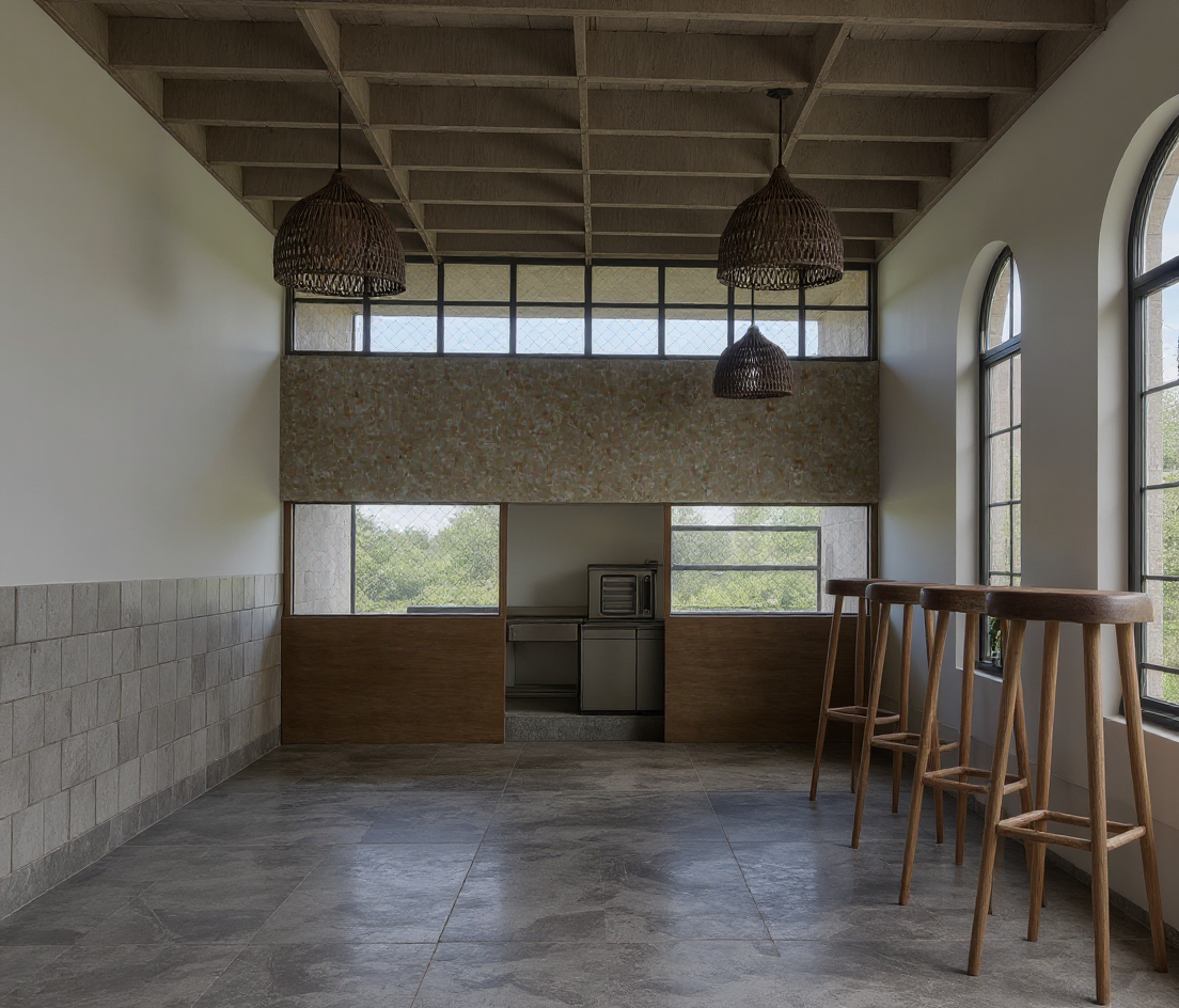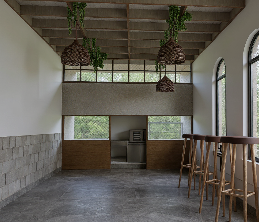 the floor is a grey porcelain there is no plant behind there is no window there are plants on the ceiling the glass has texture