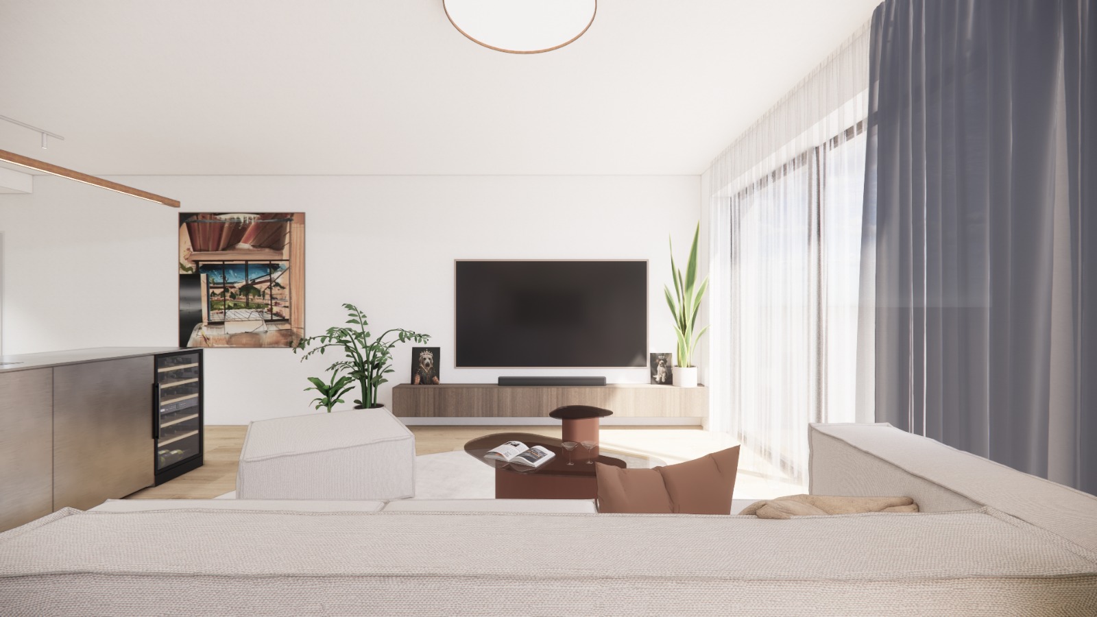 preserve materials make it real like kitchen island make from stainless steel material sofa from canvas fabric usually used for sofa preserve color of sofa and make it more cozy use white light plaster on walls and ceiling