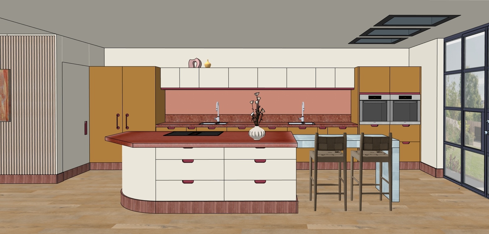 the countertop behind the taps is a terracotta red terrazzo whilst the countertop of the main island is a glazed terracotta red pyrolave the rectangular island section where the chairs are are made of muted blue zellige tiles