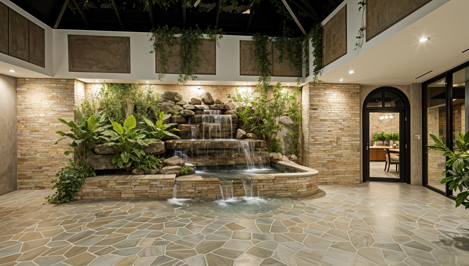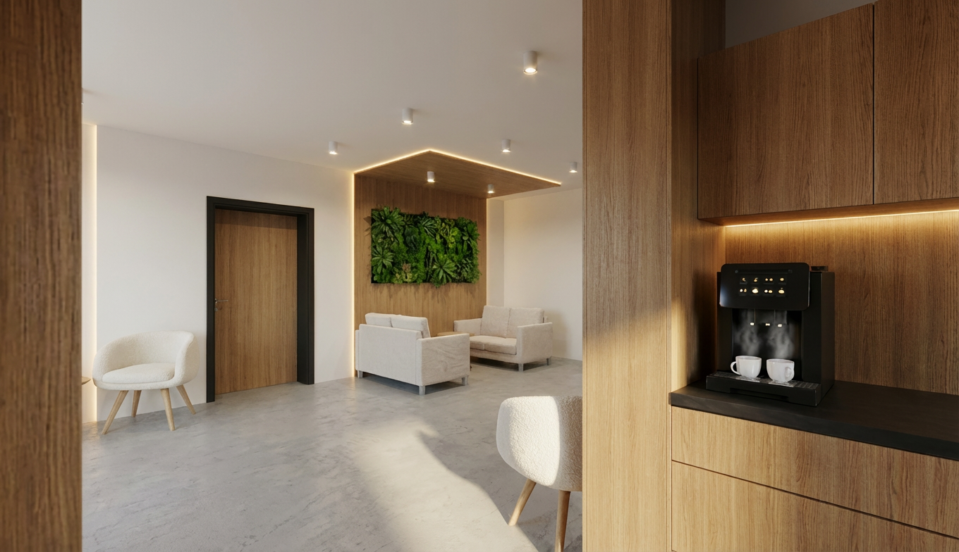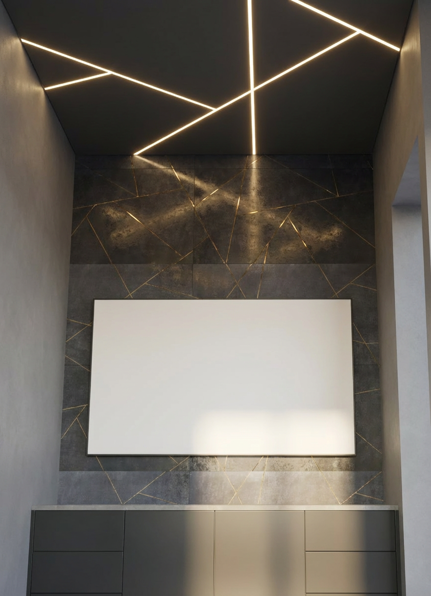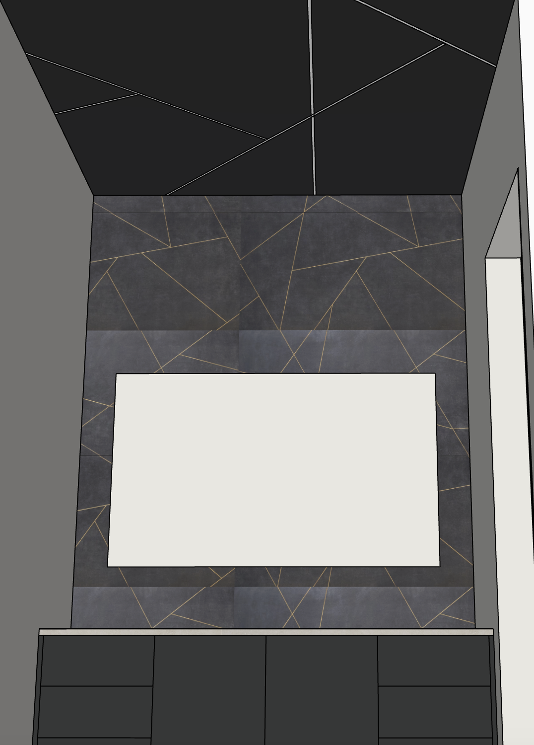 add lighting in white lines on ceiling make all textures sleek and smooth white rectangle on wall should be a mirror