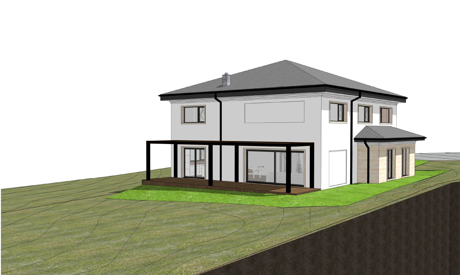 modern classical two storey villa with a hip roof and wide roof overhangs architecture based on a clean cubic volume with a separate one storey garage wing attached to the main house the main building is square and symmetrical with a four sided dark grey tiled roof facade material is smooth white stucco with minimalistic detailing windows are vertical modern classic proportions with dark anthracite aluminium frames large sliding glass doors open from the living room to the garden in front of the living room there is a minimalist black steel pergola with thin roof material is dark grey ceramic or concrete tiles ground floor has large glass openings to the garden second floor has smaller vertical windows arranged in balanced classical proportions landscape is slightly sloped terrain with green grass and minimal modern garden design lighting is warm interior lighting visible through the windows architectural visualization style ultra realistic architectural rendering soft evening light luxury villa atmosphere photorealistic materials high dynamic range lighting cinematic architecture photography wide angle lens professional architectural visualization mood modern classical villa elegant clean geometry timeless architecture
