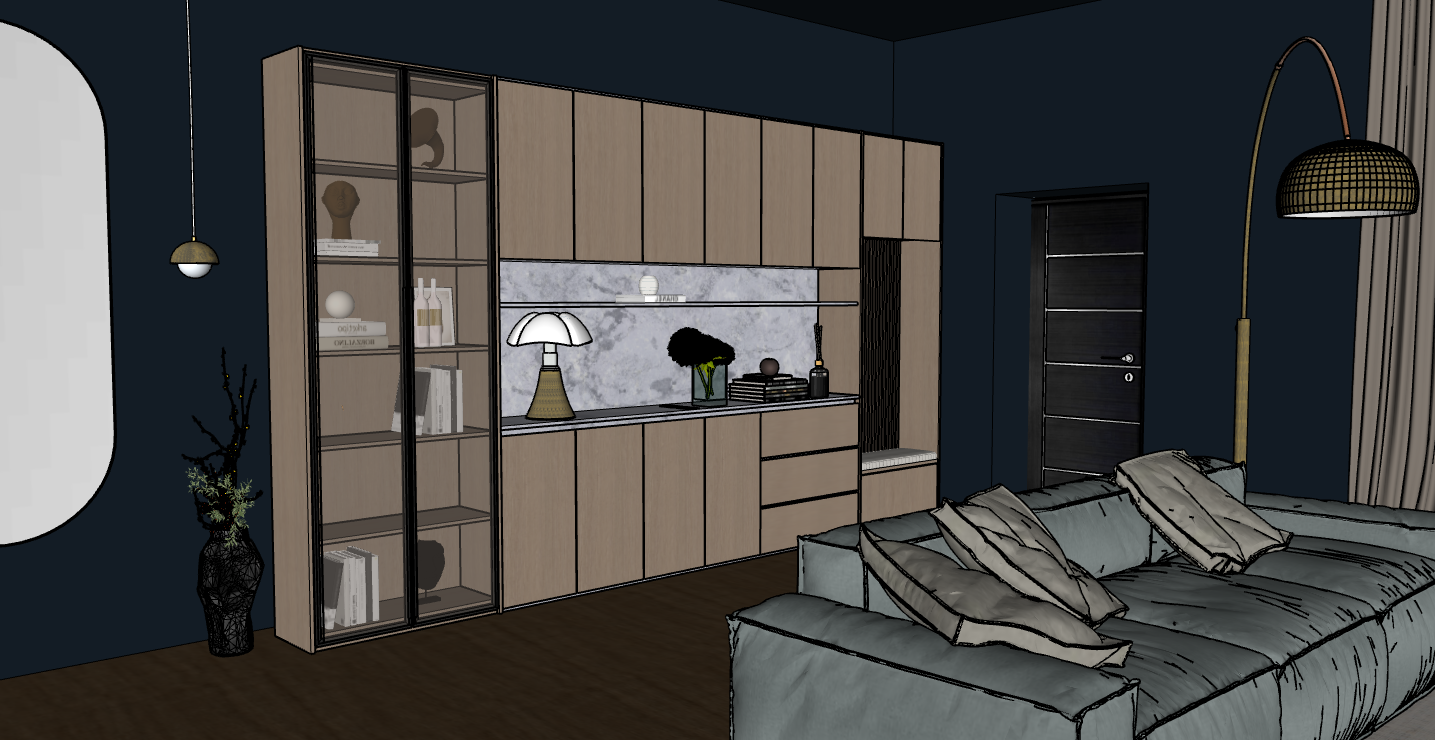 realistic rendering of this entrance in a geneva s flat add spot a the ceiling leds in the wood s furniture light up all the lights at the very left it s a miroir all the walls are covered by an elegant dark greyish blue the sofa s color is a light velvet kaki