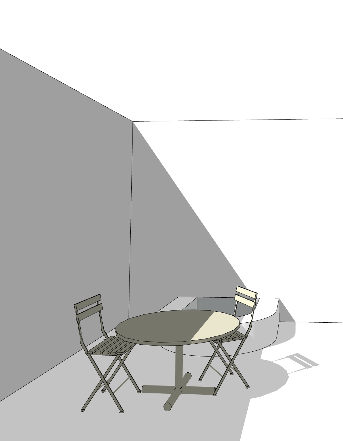 a sunlit minimalist patio featuring a round wooden table and two folding chairs the table is a deep oak color exuding warmth and rustic charm the chairs are a soft ivory hinting at modern elegance the walls are a smooth light stone gray and the floor is a textured brick the atmosphere is calm and serene with crisp shadows cast by the afternoon sun creating a harmonious blend of light and shade add some greenery and pot plants