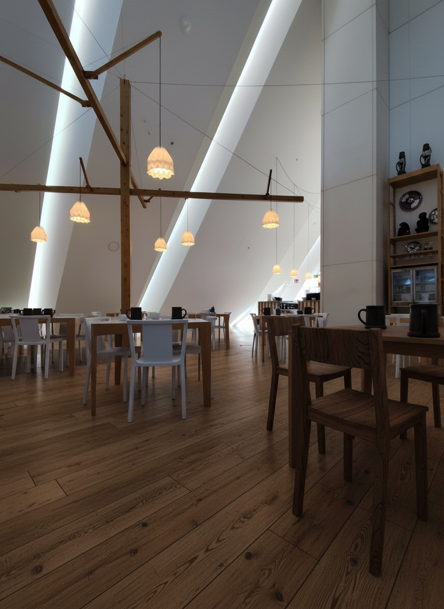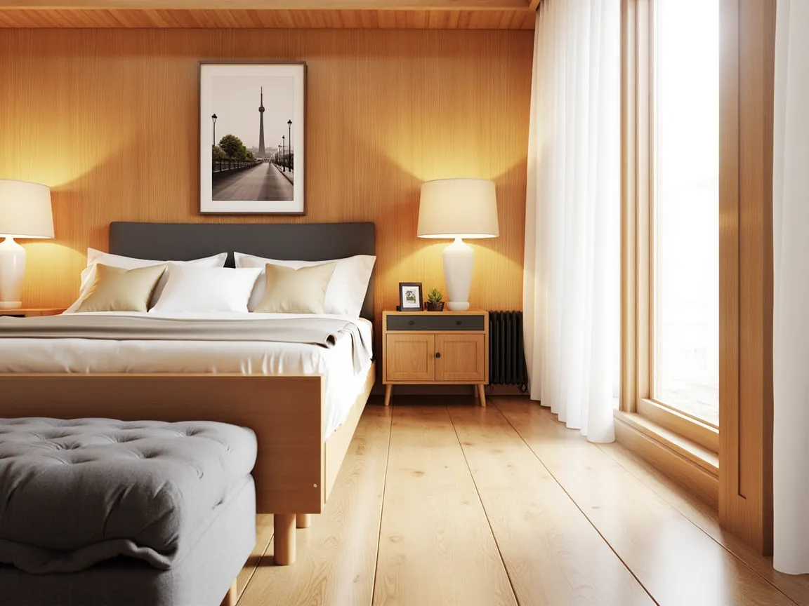 a bright well organized home office designed with a clean modern and natural aesthetic the space is dominated by light wood tones which are used consistently across the flooring shelving and desk surfaces creating a cohesive and warm visual impression on the left side of the room a wooden shelving unit holds neatly arranged storage boxes in soft neutral colors emphasizing order and functionality a round wall mirror hangs above the shelving reflecting light and visually expanding the space several indoor plants both potted and trailing are placed around the shelves and upper wall area introducing greenery and a sense of calm organic balance to the right a floating wooden desk is positioned beneath a large window fitted with a translucent blind natural daylight floods the room casting soft shadows across the floor and enhancing the room s airy atmosphere the desk is minimally styled holding a computer monitor and a small decorative vase reinforcing the uncluttered design approach a modern chair with a slim metal frame and light upholstery sits in front of the desk adding a contemporary contrast to the wood textures the walls are finished in a soft neutral color with subtle panel detailing contributing to the room s refined and understated elegance overall the space conveys a sense of tranquility productivity and thoughtful modern design ideal for focused work in a calm environment architecture