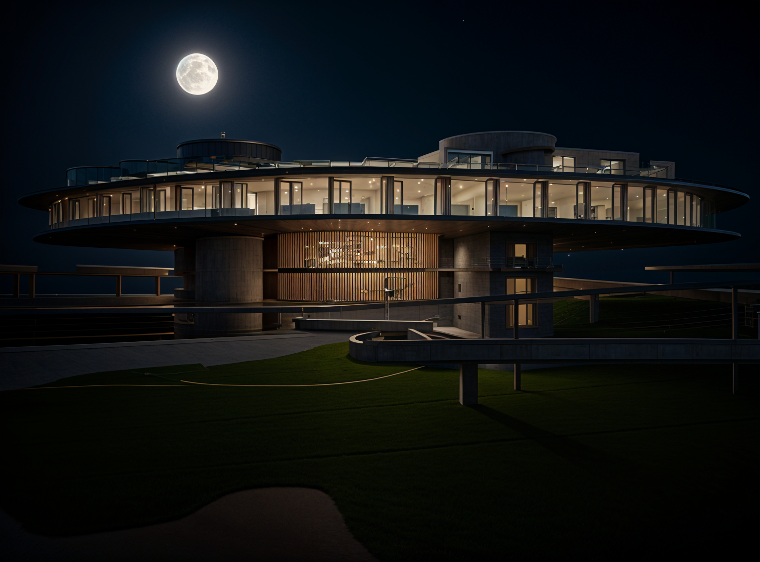 exterior shot render a pale wooden modern hillside villa overlooking the ocean with elegant lines and open spaces the lowest terrace is topped by a neatly planted vegetation patch the middle terrace features an infinity pool with decking surrounded with steps leading to the main dwelling above use a crisp cerulean blue sky as the backdrop illustrate the villa with a blend of beige and light tan walls accented by sleek black trim the roof should be a sophisticated dark slate surround the setting with lush vibrant green grass and foliage with detailed palm and deciduous trees scattered around their leaves gently rustling in a light breeze the atmosphere should feel serene and inviting with warm natural lighting casting soft shadows to emphasize the villa s architecture and the slope of the terrain capture the distant glint of a tranquil blue lake adding depth and tranquility to the scene