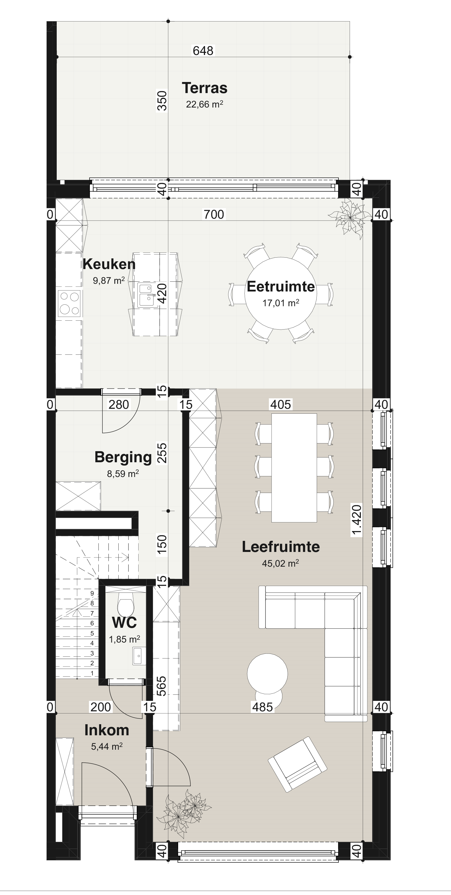 convert this floor plan into a realistic isometric 3d view of a full house show the space from an elevated angle with furniture walls and details visible keep the plan that was just created but change the green in the kitchen to grey the bottom window cannot be opened so it needs to be a fixed window the short section on the right side of the stairs must also be removed add sunlight use the same furniture as shows on the plan do not change the orientation of the floorplan