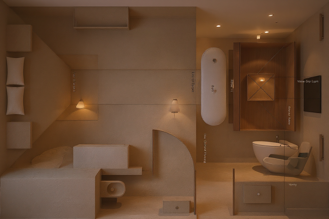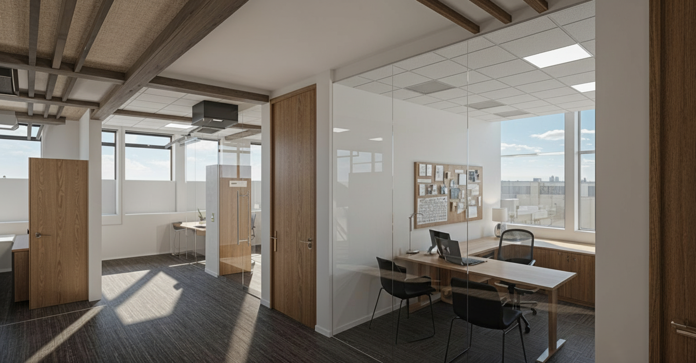 office with glass fronts ceiling tile in the offices and open ceiling in the corridor with exposed pipes