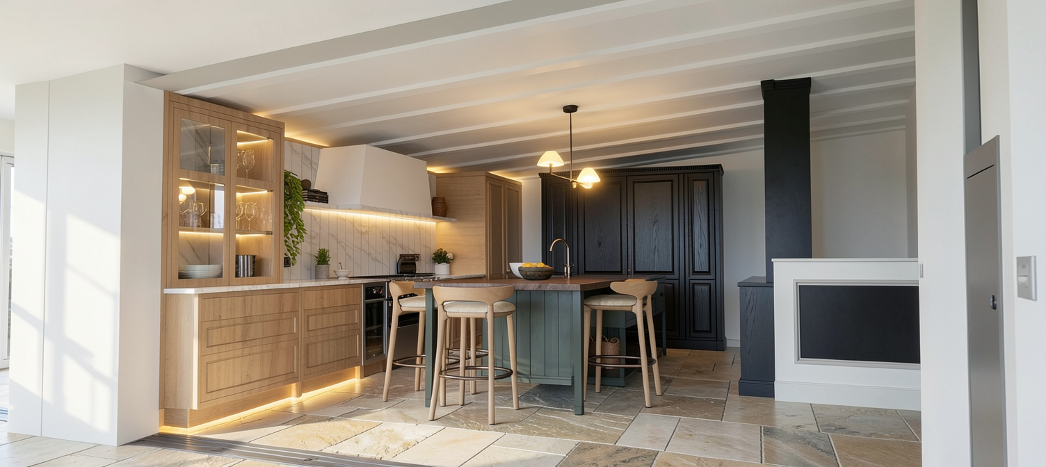 maintain colours in image add natural daylight add flooring with large limestone slab flooring random sizes add led lighting under marble shelves glazed cabinet shelves