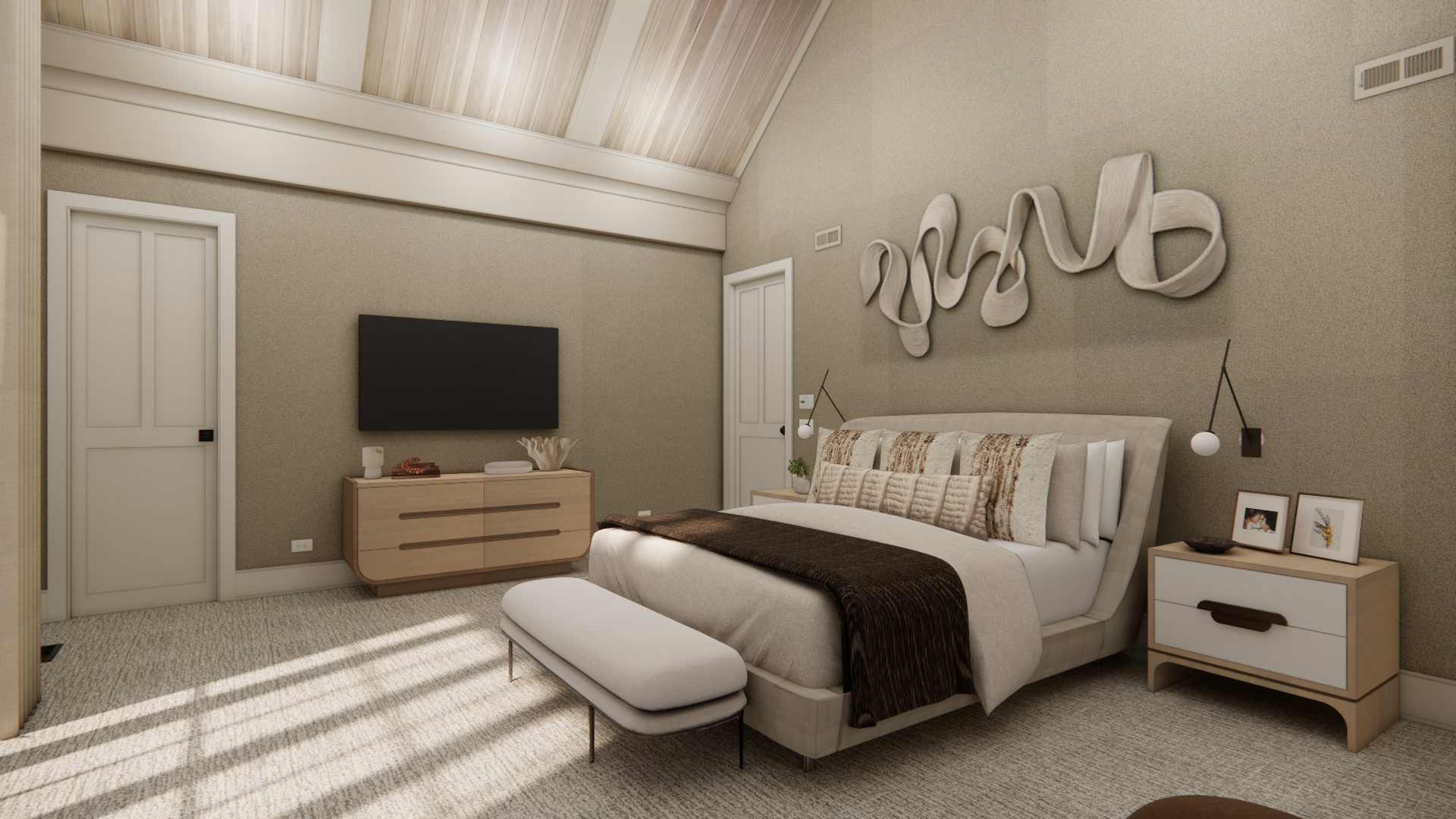 enhance this render to look more realistic improve lighting shadows reflections and material realism but do not add remove or alter any elements objects or materials keep everything exactly the same just make it more photorealistic keep the space bright and airy