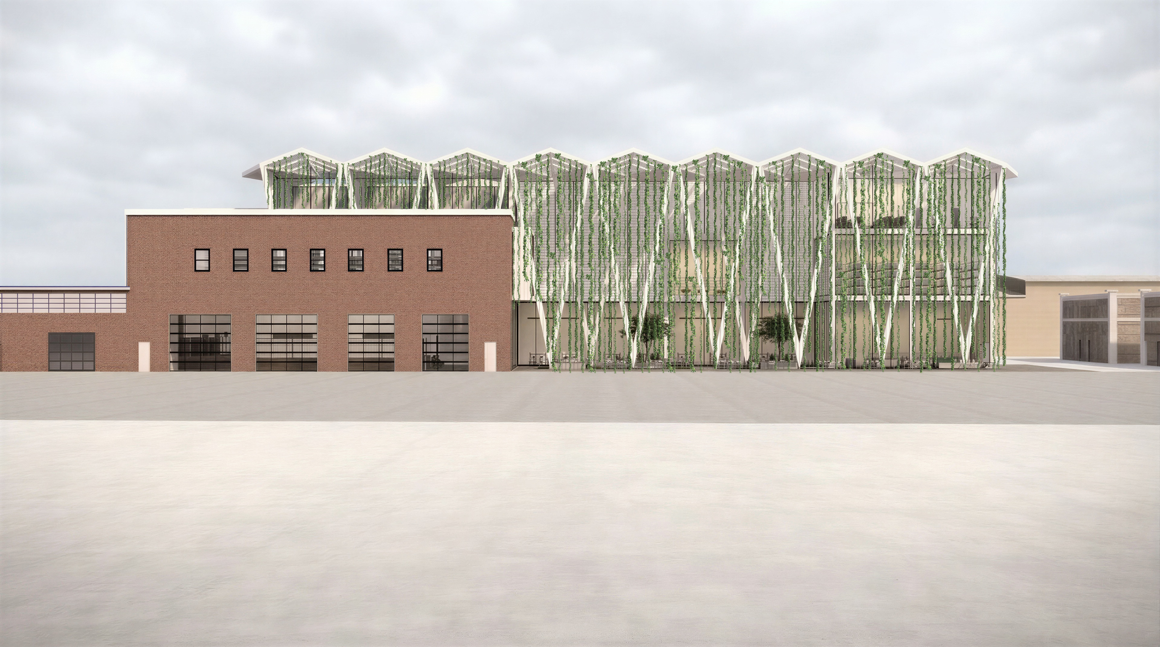 use this image exactly as is do not change the architecture framing fa ade layout crop proportions ground or window configuration focus on the vines only improve vine realism and resolution make greenery more detailed and natural leaf clusters variation shadows thickness variation keep the vertical cable based growth logic unchanged increase density only slightly so coverage reads intentional but not overgrown maintain visible structure behind vines not fully covered keep everything else identical do not modify the brick color structure shape glazing column geometry roof form or light temperature keep the overcast atmosphere exactly as shown keep interiors identical no new lighting changes this is a micro texture and realism pass only refine vine material edge clarity softness and shadow connection to structure