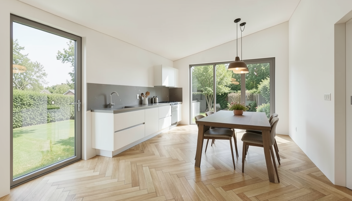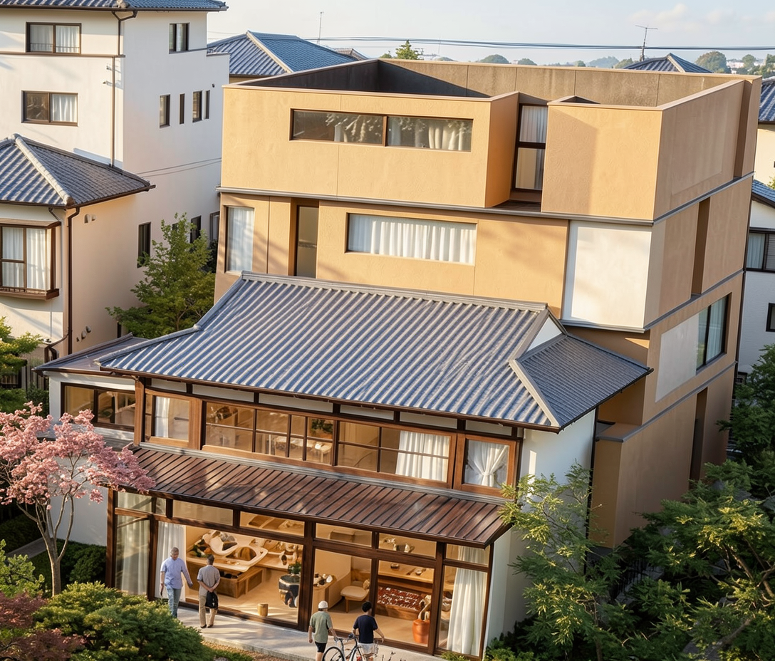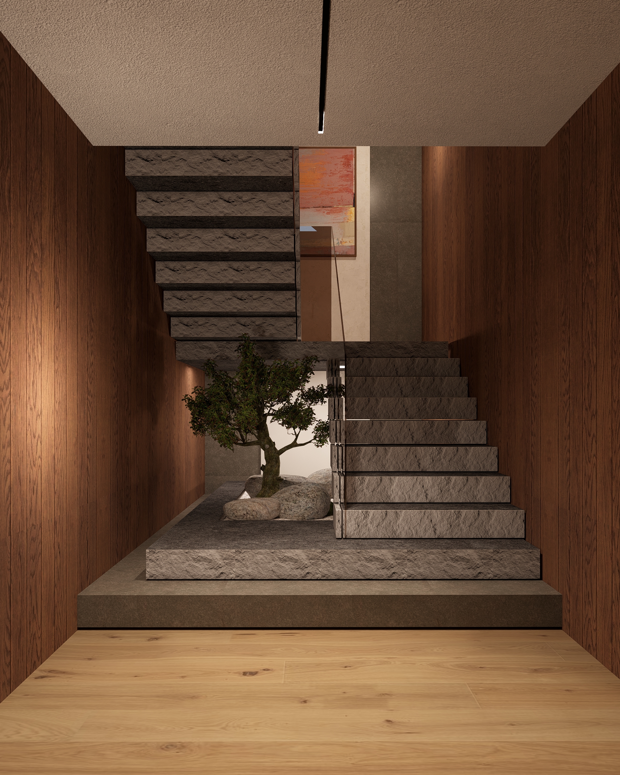 transform this non realistic architectural visualization into a hyper realistic photorealistic render strictly preserving the exact original composition framing proportions structure and perspective no windows anywhere in the image no external light sources swap all materials to highly realistic versions preserving the main color palette stairs made of ultra realistic brushed flamed granite with highly detailed seamless non repeating natural texture variations imperfections and subtle mineral flecks add natural subtle gloss and sheen to metals and plastics stone textures with seamless non repeating natural variations detailed dark wood surfaces do not change wood color with visible grain s oje knots and light roughness texture for authenticity maintain bright high key lighting from internal dynamic sources creating high contrast sharp shadows and vivid highlights no dark areas overall bright and airy atmosphere enhance depth with realistic environmental reflections soft atmospheric haze and professional 8k resolution details architecture