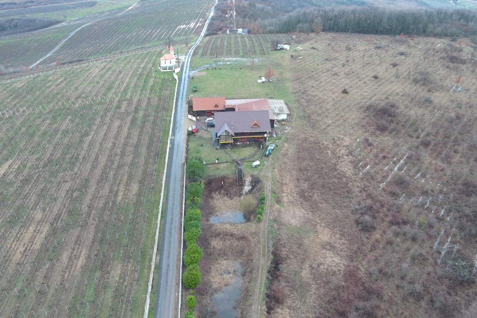 rows of grapevines grow in organized lines across the sloping terrain supported by thin wooden vineyard posts and wires the vineyard follows the natural contours of the hill creating soft diagonal patterns across the landscape the environment is lush and mediterranean with olive trees wild grasses shrubs and layered vegetation integrated into the terrain terraced stone retaining walls blend into the hillside lighting is warm golden hour sunset light with long soft shadows stretching across the vineyard rows the sunlight is soft and slightly hazy creating a cinematic and peaceful atmosphere colors are natural and warm deep vineyard greens dusty soil tones warm stone textures soft golden sunlight slightly desaturated sky rendering style ultra realistic landscape visualization cinematic composition natural colors soft atmospheric perspective highly detailed vegetation photorealistic vineyard environment