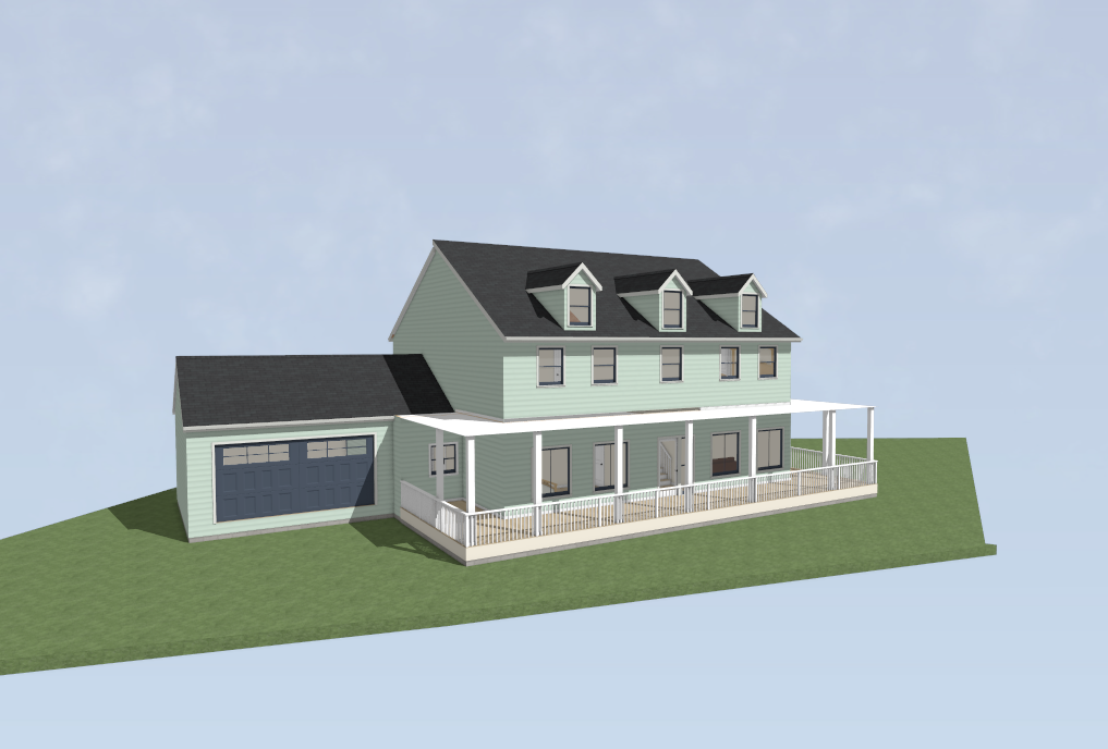 modernist exterior shot ultra realistic architectural render of a classic australian coastal farmhouse modern barn inspired home symmetrical front elevation white weatherboard cladding standing seam metal roof in soft silver zinc tone double storey form with central gable and dormer windows full length wraparound veranda with white square posts and simple timber balustrade wide timber front door with glass panels black framed windows evenly spaced soft traditional detailing no ornate trims clean modern farmhouse aesthetic set on a landscaped rural coastal block with manicured lawn subtle garden beds stone stepping path to front stairs warm natural daylight photorealistic materials and shadows realistic scale and proportions architectural photography style 35mm lens eye level perspective ultra high resolution crisp details premium home builder marketing render australian farmhouse style neutral tones calm and timeless architecture