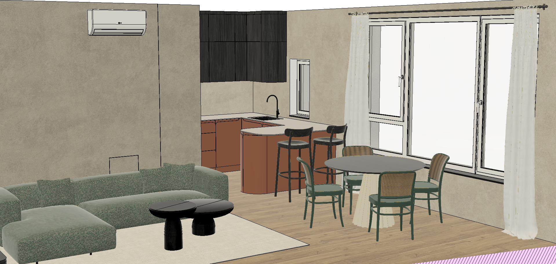 use the provided image as a strict reference for camera angle composition proportions furniture placement and architecture maintain the exact geometry and layout of the scene transform the reference into a high end photorealistic interior visualization with refined materials and natural lighting ensure that all visible 3d objects have smooth geometry remove or smooth any visible mesh structure or polygon edges so that furniture cabinetry and architectural elements appear clean continuous and professionally modeled with no faceted surfaces or low poly artifacts soft sunlight enters through the large window on the right side creating gentle shadows and a calm atmosphere living area a medium dark green fabric sofa with rich woven textile texture is placed along the wall the green color should be slightly cool toned and elegant below the sofa is a light grey rug with a soft but visible fiber structure the two coffee tables in front of the sofa are made from light warm toned concrete matte surface with subtle natural imperfections kitchen cabinetry is terracotta colored with precise integrated milled finger pull handles following the reference geometry upper kitchen cabinets are black stained wood with subtle wood grain the upper cabinet corner near the window is rounded creating a soft curved transition at the end of the cabinet the countertop is light grey stone with a refined matte finish install warm led strip lighting under the upper kitchen cabinets creating soft functional illumination of the countertop the wall on the right side near the window is finished with warm toned concrete microcement plaster this surface continues seamlessly into the kitchen corner and also forms the backsplash area beneath the upper kitchen cabinets creating one continuous material surface the kitchen peninsula is rounded on the side where the passage occurs the base of the peninsula forms a precise semicircle creating a soft curved circulation path the countertop extends beyond this curved base forming a slight overhang that creates comfortable leg space for seating at the peninsula there are bar stools made from black stained wood elegant and minimal matching the darker wood elements used elsewhere in the interior on the upper part of this wall there is a wall mounted air conditioning unit behind the sofa there is also a small flush service door outline finished in the same microcement surface dining area near the window a round dining table made from black stained wood stands near the window the table has a beige sculptural base with a soft matte finish around the table are dark green dining chairs in a slightly cooler green tone elegant and modern with dark frames seat upholstery in textured fabric and backrests made from woven natural rattan cane window and curtains large window and balcony door allow soft natural daylight to fill the interior the window frame color is bright white clean and crisp light textured curtains hang on both sides of the window ceiling and lighting the ceiling is finished with smooth white plaster flooring the floor is brown natural oak wood matte finish with subtle grain style ultra photorealistic architectural visualization natural materials soft daylight warm balanced tones high material realism subtle imperfections elegant modern apartment interior architectural photography style