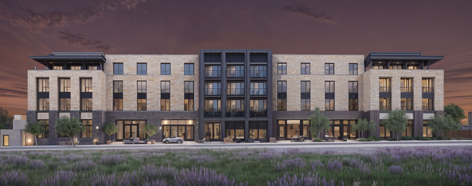 a industrial hotel in fort worth texas plaster and stone walls steel framed windows strong geometric forms rooftop terraces with greenery symmetrical fa ade and dramatic nighttime architectural lighting western traditional design architecture
