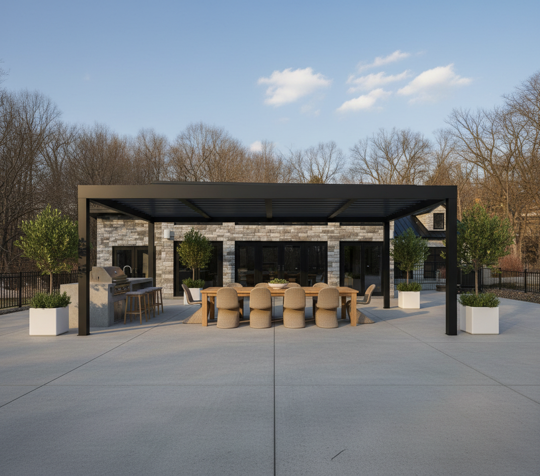 keep the pergola structure pool house kitchen layout and camera angle exactly the same do not change proportions or scale clean up landscaping very important remove excess greenery and landscaping do not create full planting beds or natural garden areas instead use minimal intentional greenery only in large architectural planters planers controlled architectural place large cast concrete planters only at key structural points at pergola posts near corners of the space clustered in small groups 2 3 max per area planters should feel collected intentional sculptural use olive trees ornamental grasses simple structured greenery do not fill the entire perimeter with plants left side pool relationship critical keep the left side of the pergola clean and open suggest the presence of a pool by a clean linear edge subtle reflection or water line minimal obstruction do not add planters or landscaping that block the pool edge right side add pool feature add a long linear pool or water feature along the right side of the pergola it should run parallel to the structure and feel modern and minimal keep it low profile and elegant kitchen island refinement keep the kitchen and island but refine them make the island slightly larger and more substantial ensure clear spacing between island and kitchen wall keep materials clean plaster concrete stone overall style reduce visual noise the space should feel architectural minimal luxury intentional not landscaped or garden heavy lighting finish keep warm natural light clean shadows neutral tones