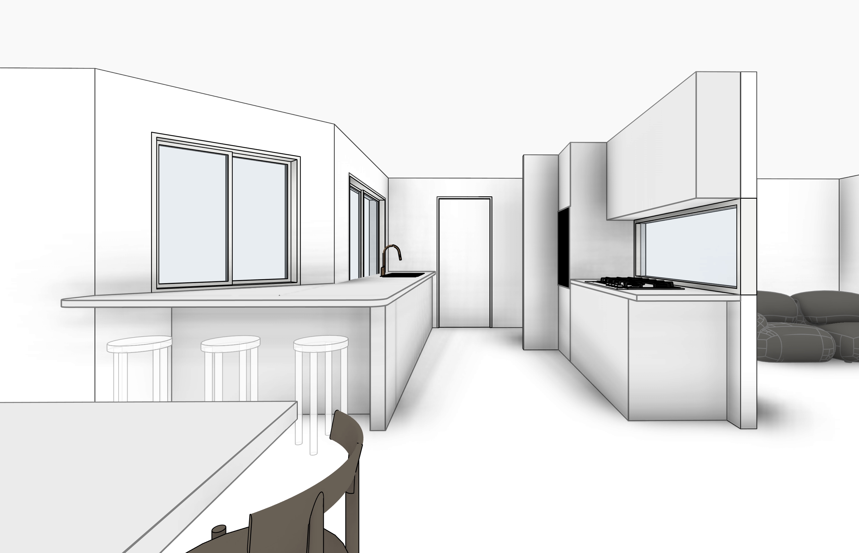 interior shot hamptons kitchen with japandi influence eye level interior perspective flat front shaker cabinetry in soft white with matte black hardware fluted island base in white with honed travertine stone benchtop under cabinet warm led strip lighting large format limestone floor tiles with grout lines woven rattan pendant lights black tapware white oak timber accents crisp natural daylight from large windows subtle shadow play highly detailed photorealistic render 35mm lens architecture