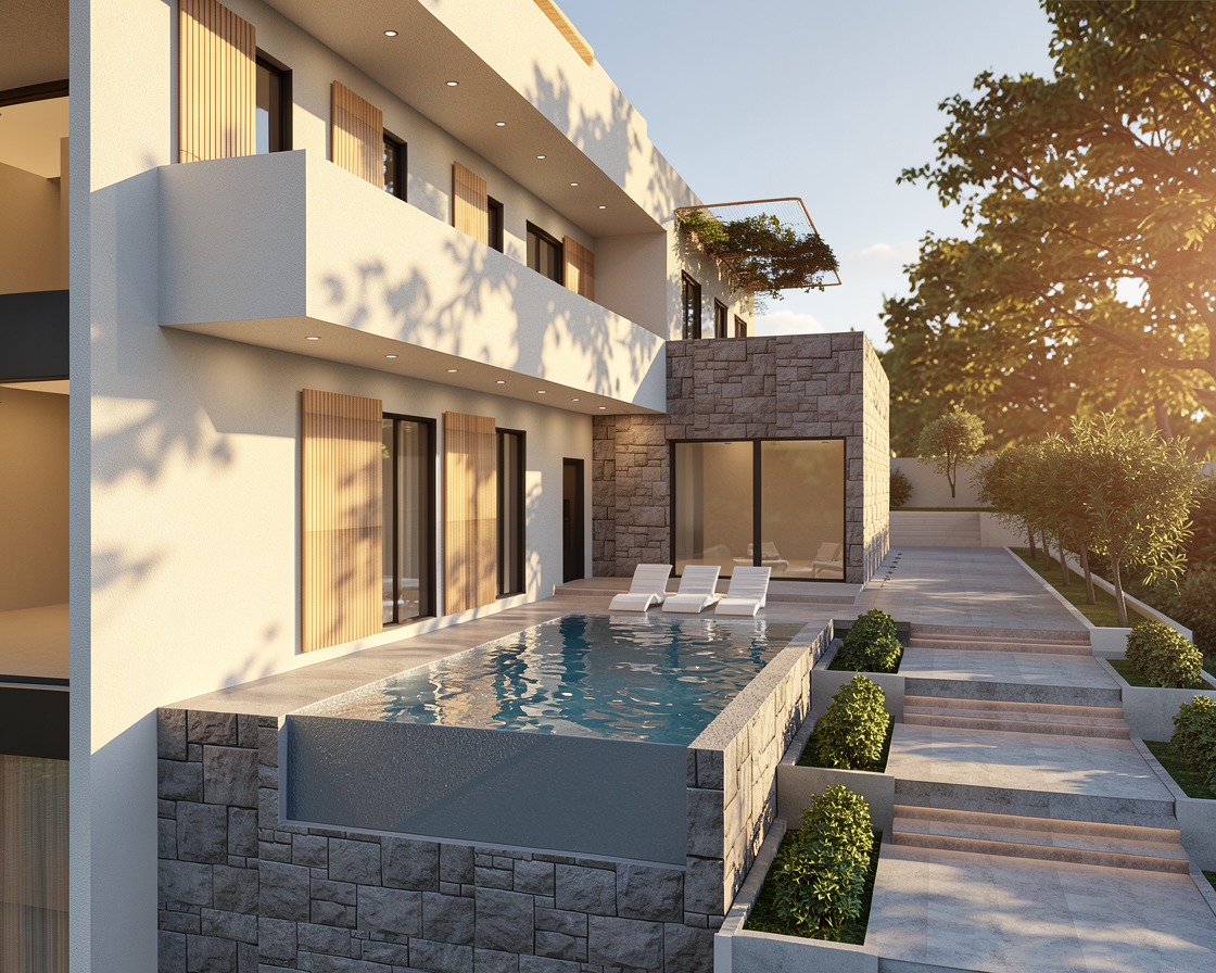 render ultrarealiztic shto aksesore gjelberim mesdhetar dhe uji te duket shume real panelet e drurit te duken natyrale dhe guri te jete me texture
