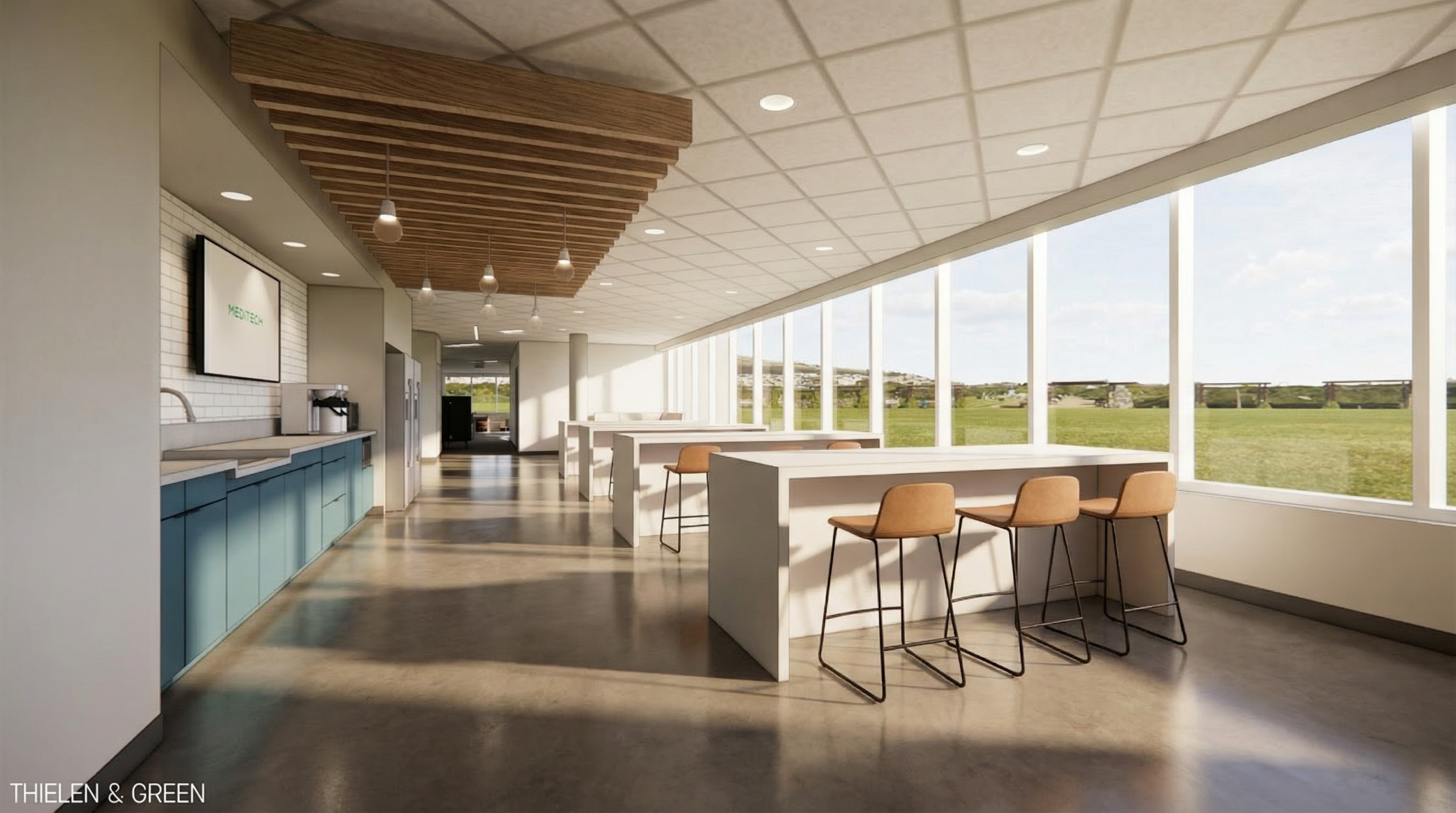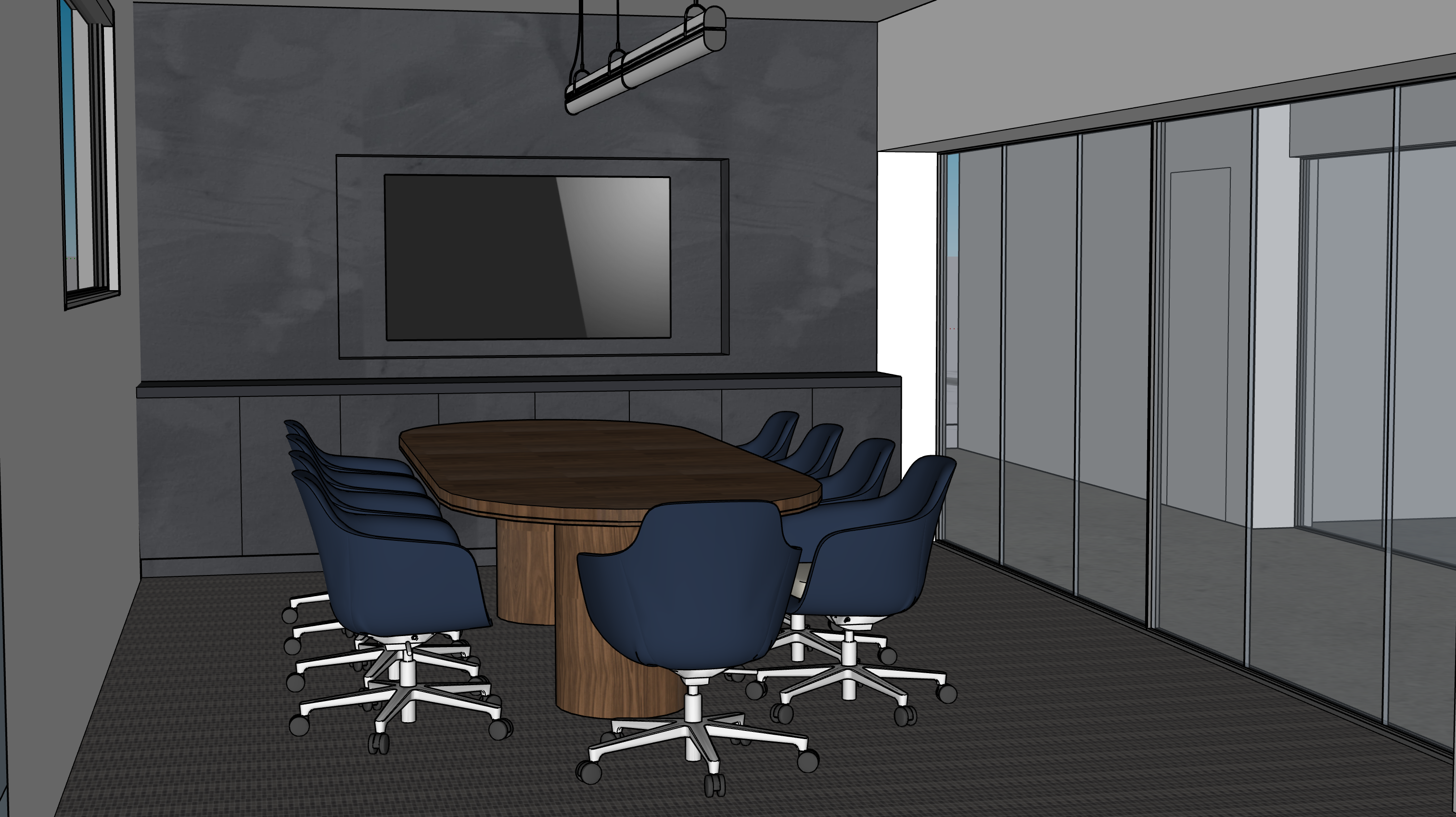 please make the lighting soft bright even and warm keep materials as shown in image make the flooring outside glass partition concrete flooring the conference table is a warm walnut add wood slats in the ceiling