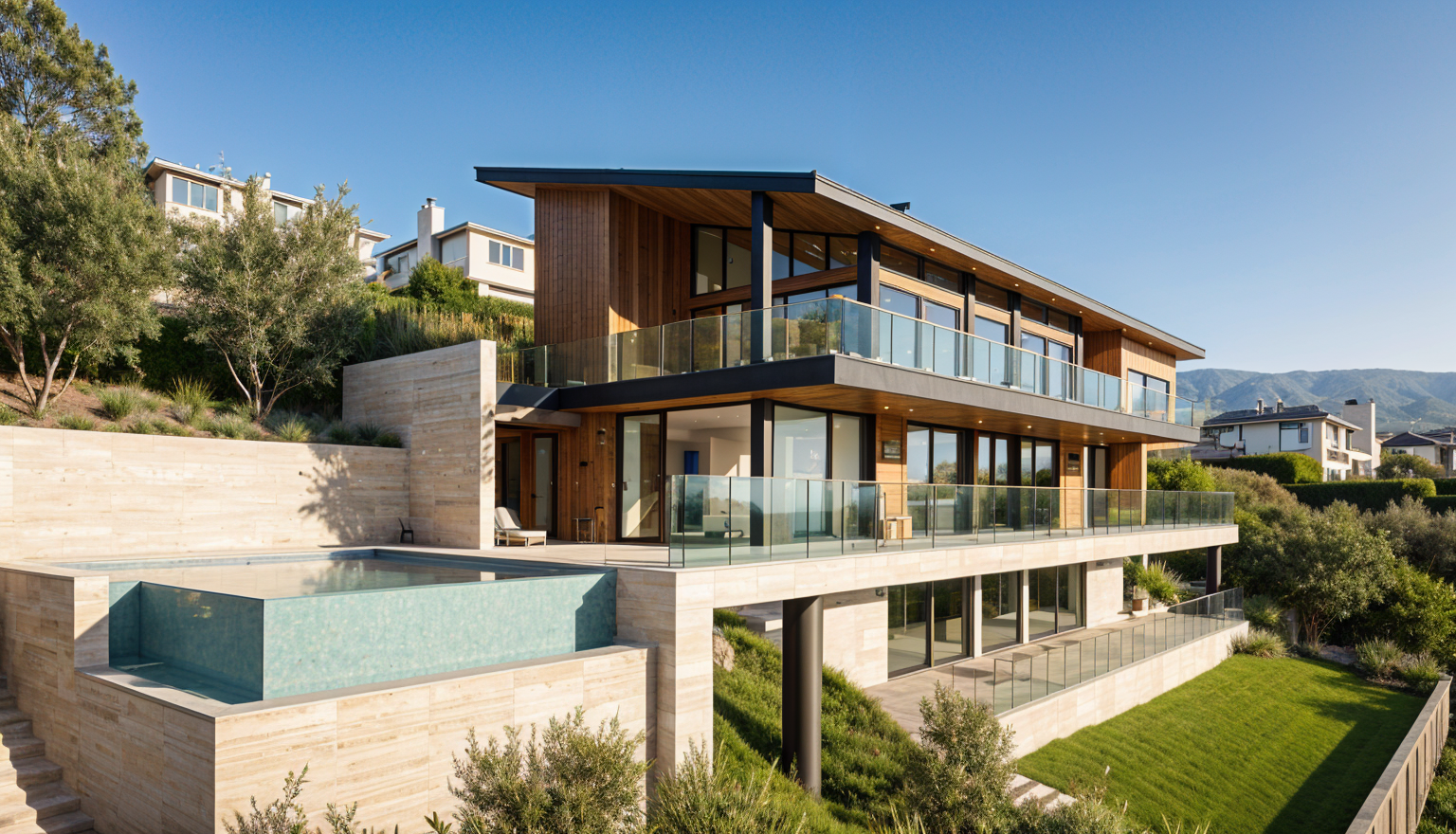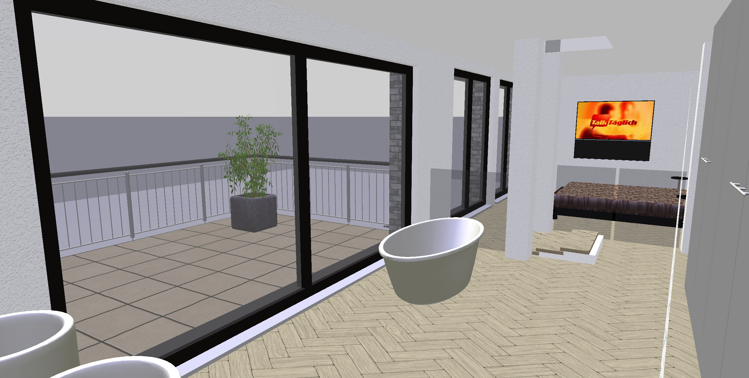 genau dieses rendering berarbeiten fotorealistisches innenraum foto exakt dieselbe perspektive und kameraposition wie das hochgeladene referenzbild 100 identische raumgeometrie exakt gleiche m belanordnung exakt gleiche verlegeart und richtung von parket wie vorlage exakt identische fensterpositionen mit gleichem ausblick durch die fenster weiches nat rliches tageslicht leicht schr g einfallende sonne durch die grossen fenster geschlossene r ume k nstlich ausleuchten sanfte realistische schatten blickrichtung ist nach osten sonnenlicht kommt von s den realistische materialien echte holztexturen stoff mit leichten gebrauchsspuren hochwertige oberfl chenreflexionen kleine gr npflanzen lavabo aus marmor collemandina grigio in braungrau dunkel dahinter je eine vola standarmatur fs2 edelstahl badewanne austauschen mit organischem modell von antonio lupi in collemandina grigio braungrau dunkel mit standarmatur fs1 edelstahl links hinten bei den lavabos hat es einen schrank f r badet cher schrankfronten alle grauglas gl nzend grifflos parket vergraut vollkommen rahmenloser spiegel rechts hinter den lavabos ist die dusche hell ausgeleuchtet alle sichtbaren w nde sind sichtbeton graues badetuch l ssig ber badewanne werfen sehr modernen minimalistischer look nat rliche farbwiedergabe golden hour feeling das bild muss wie eine professionelle fotografie aussehen es soll ein echtes und reales foto sein canon eos r5 35 mm festbrennweite f 2 8 hyperrealistisch dslr qualit t raw aufnahme 8k aufl sung extrem scharf perfekte tiefensch rfe professionelle architekturfotografie