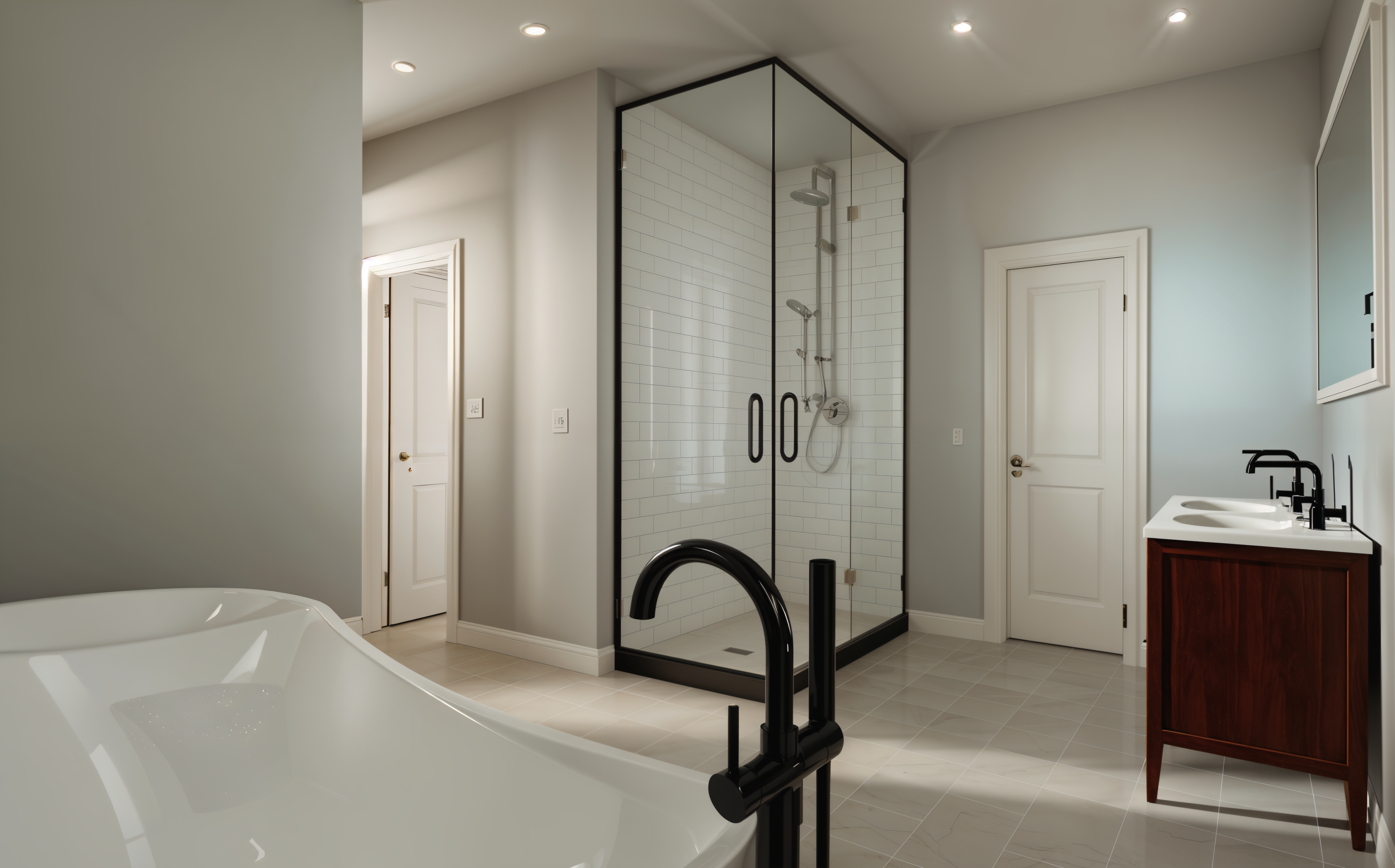 rectangular floor tiles recessed lights on ceiling grey walls black fixtures in shower black double vanity