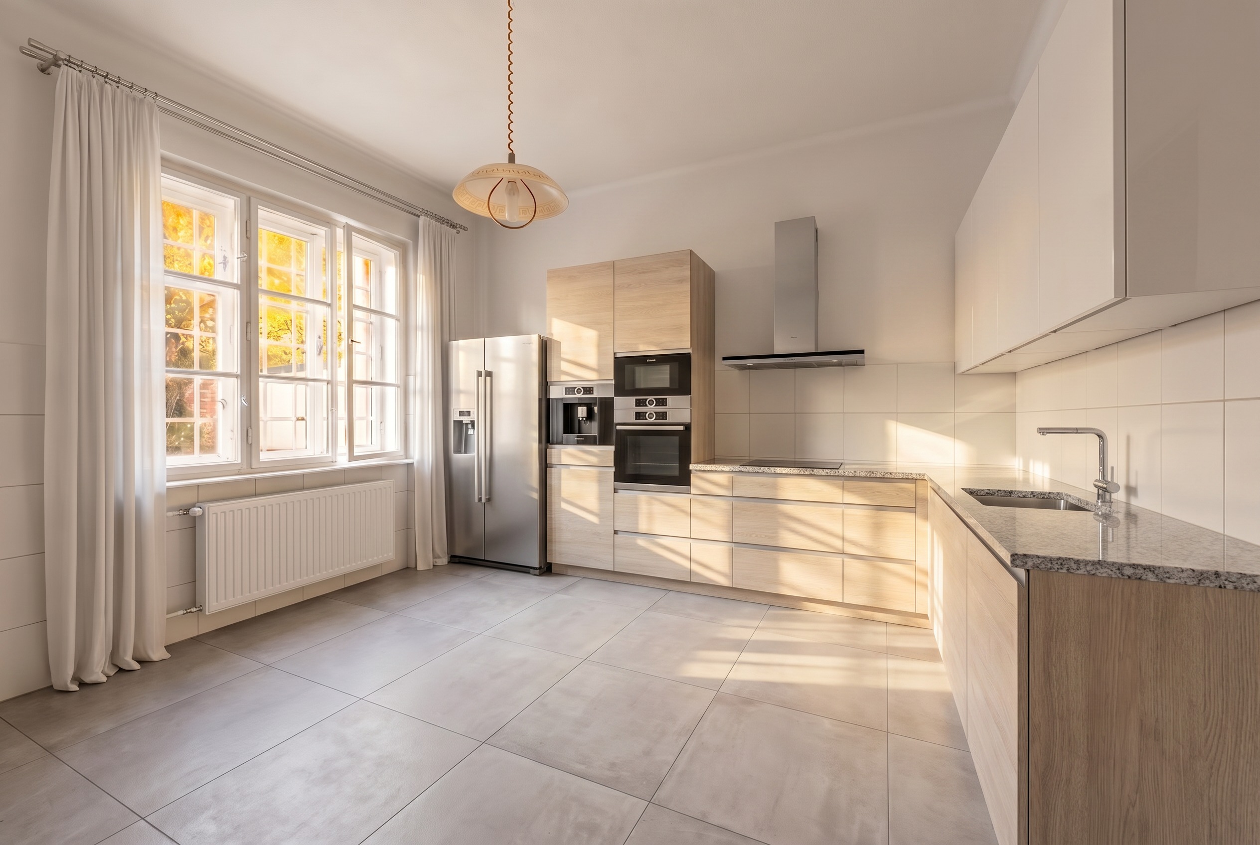 odstra obklady na st n vlevo za z v sem posu varnou desku s digesto o 10 cm doprava vykresli velk modern kruhov sv tidlo zav en pod stropem prot hni kuchy skou sestavu vpravo a do rohu m stnosti