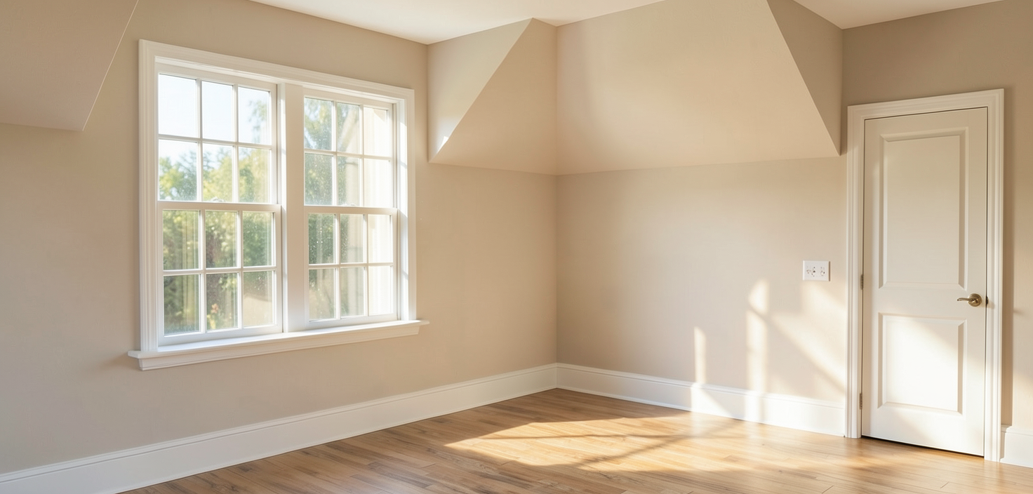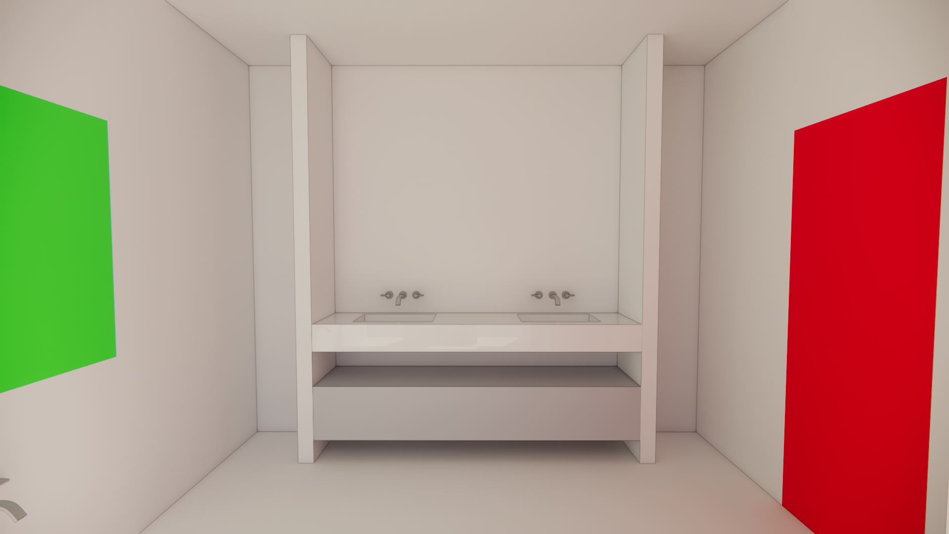 keep everything else the same white not materials or texture just add where is is highlighted red a modern flush pannel door in white ad what s highlighted green is a window make a white modern window with molding outside the window have trees