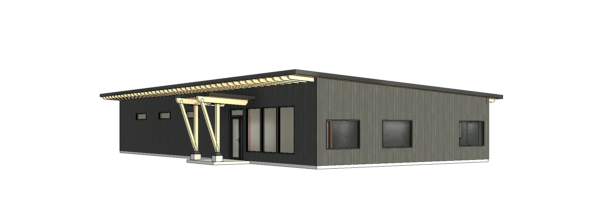 place this building on an asphalt parking lot in front and gravel on the sides with trees native to lake tahoe in the background the grading slowly rises in the background blue sunny skies