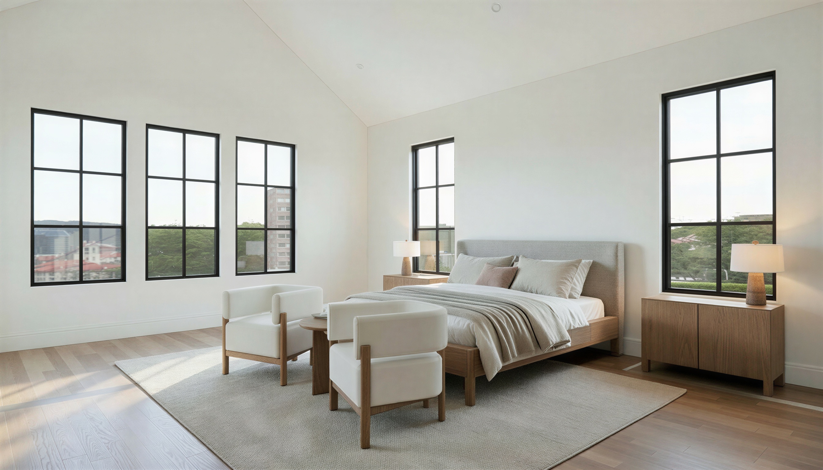 render the image as a highly photorealistic architectural digest style interior photograph lighting should combine soft natural daylight entering from the windows with a warm glow from the bedside lamps creating balanced interior bounce light and gentle shadows materials should appear true to life with accurate texture and depth natural wood grain in the flooring and furniture soft organic cotton fabrics and subtle texture in the area rug avoid wide angle distortion or warped perspective the image should feel like it was captured by a professional architectural photographer with straight vertical lines and natural proportions the final image should appear crisp warm calm and convincingly photographic suitable for a luxury real estate listing