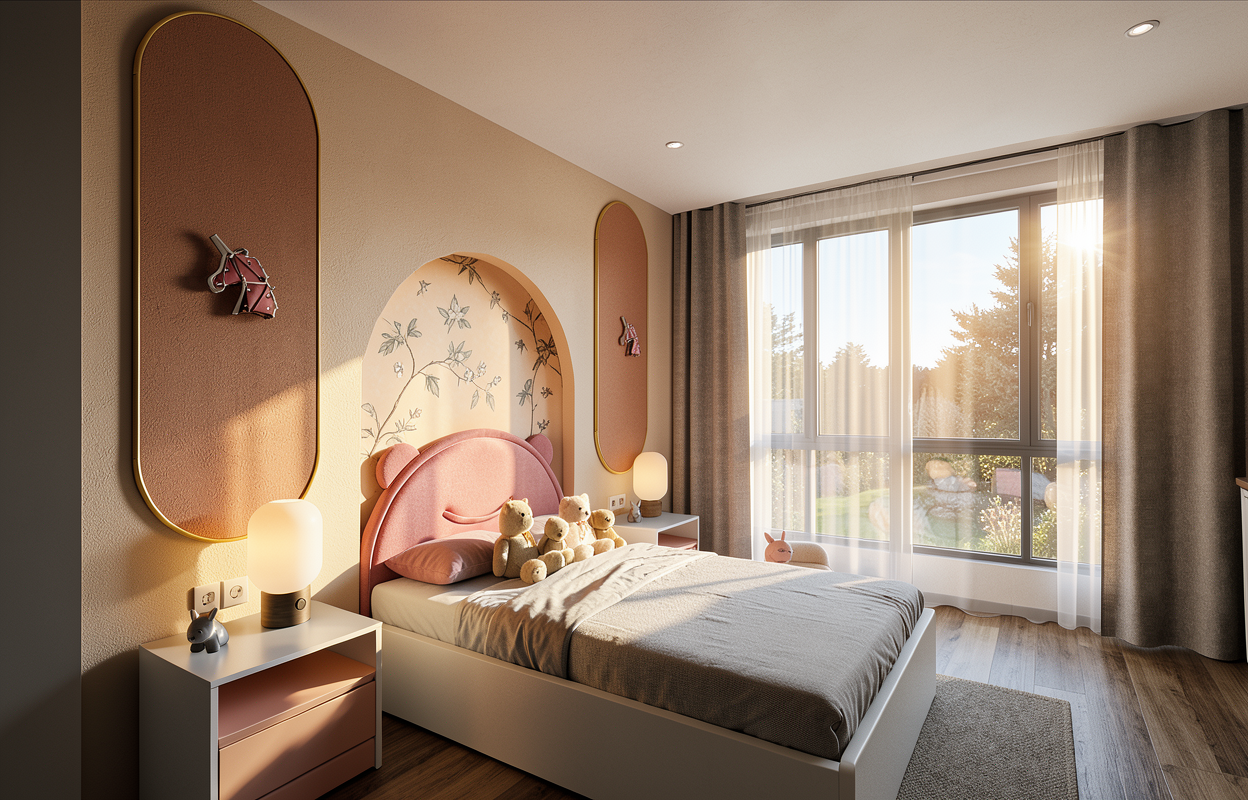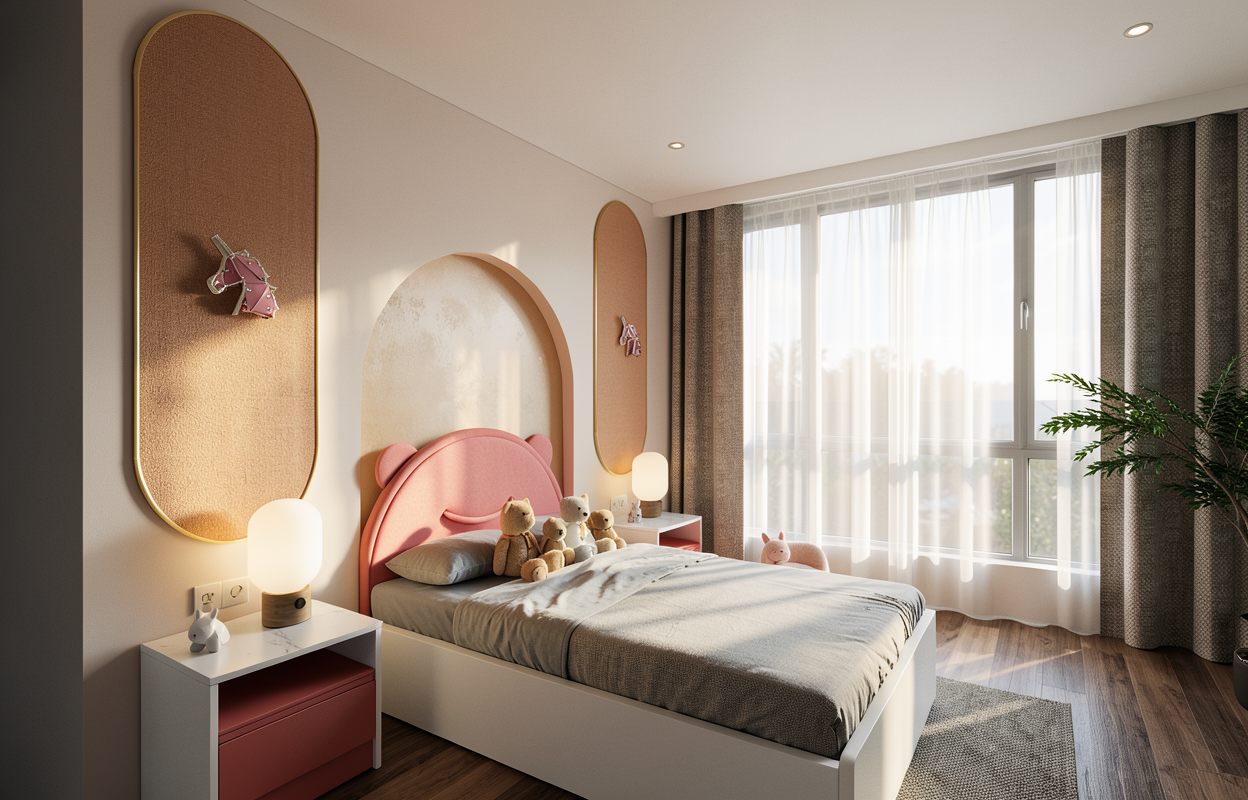 remove the potted plant light grey wood floor add some kid toys and decorations add cute kid wall lamp on 2 bed feature walls remove the unicorn