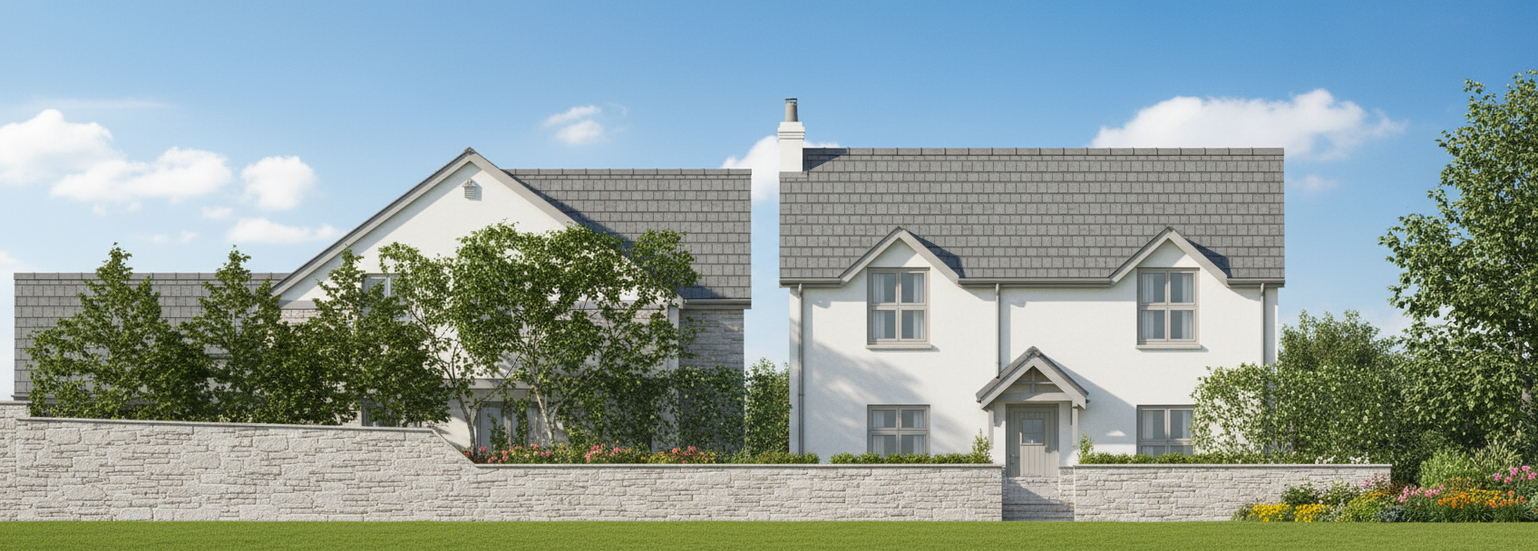 daylight white walls low stone wall forefront of building grey eaves on building no gap in forefront wall chimney stack red brick forefront wall in brown stone no gap forefront wall road in forefront with a car