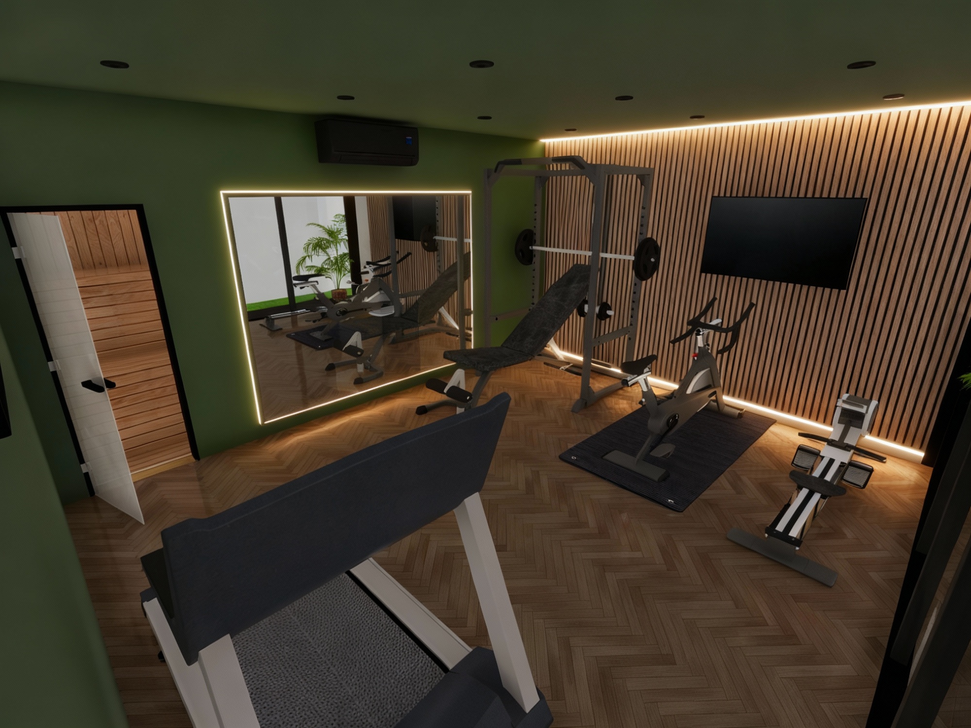 paint the walls and ceiling in ral 6009 fir green the ceiling is higher at the front and slopes slightly downward toward the back add warm white led strip lighting around the mirror and warm white led lighting above and below the wooden slatted feature wall reduce the height of the slatted feature wall so the top runs level creating a gap of approximately 100mm at the back that increases toward the front due to the ceiling slope and maintain a consistent 100mm gap along the bottom