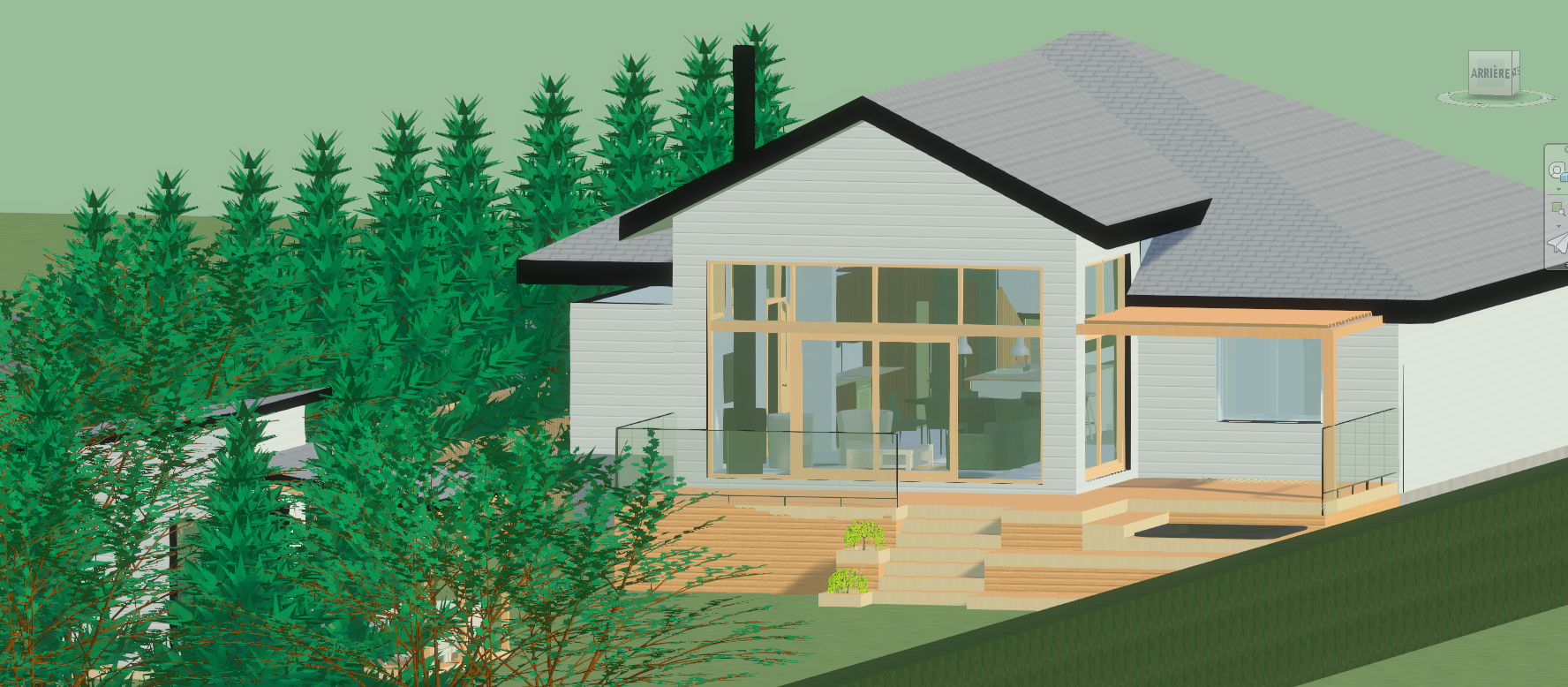 modern exterior shot photorealistic exterior architectural photograph of a modern residential building in st j rome quebec the building features horizontal grey wood siding cladding it is situated on a large wooden suburban lot characterized by expansive grounds that are purposefully minimalist native large mature deciduous and coniferous trees are strategically placed providing a sense of privacy neighbors are visible but integrated seamlessly into the background the overall landscaping is simple and uncluttered featuring very few flowers a dense mature cedar hedge defines one side of the property perimeter and a traditional slightly weathered wood fence the other extending from the house is a restricted elevated wooden balcony structure covering only a few feet and not the entire grounds seamlessly embedded and recessed into this elevated deck is a luxurious modern hot tub spa slightly steaming positioned elsewhere on the spacious wooden deck is a stylish permanent wooden pergola structure defining a cozy outdoor dining area minimalist garden beds with just a few carefully selected flowers are located immediately around the base and perimeter of the elevated gallery high resolution textures realistic daytime lighting professional composition depth of field natural and organic feel unreal engine 5 render style architecture