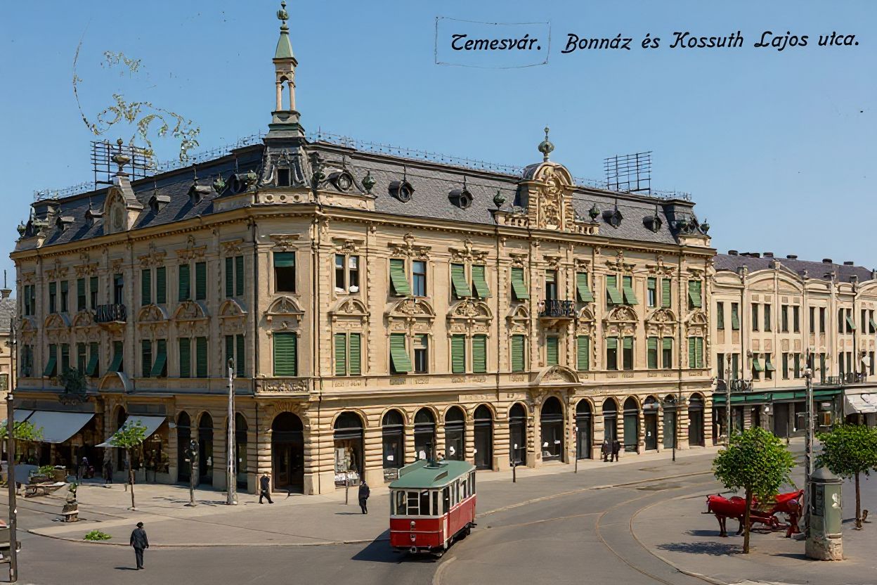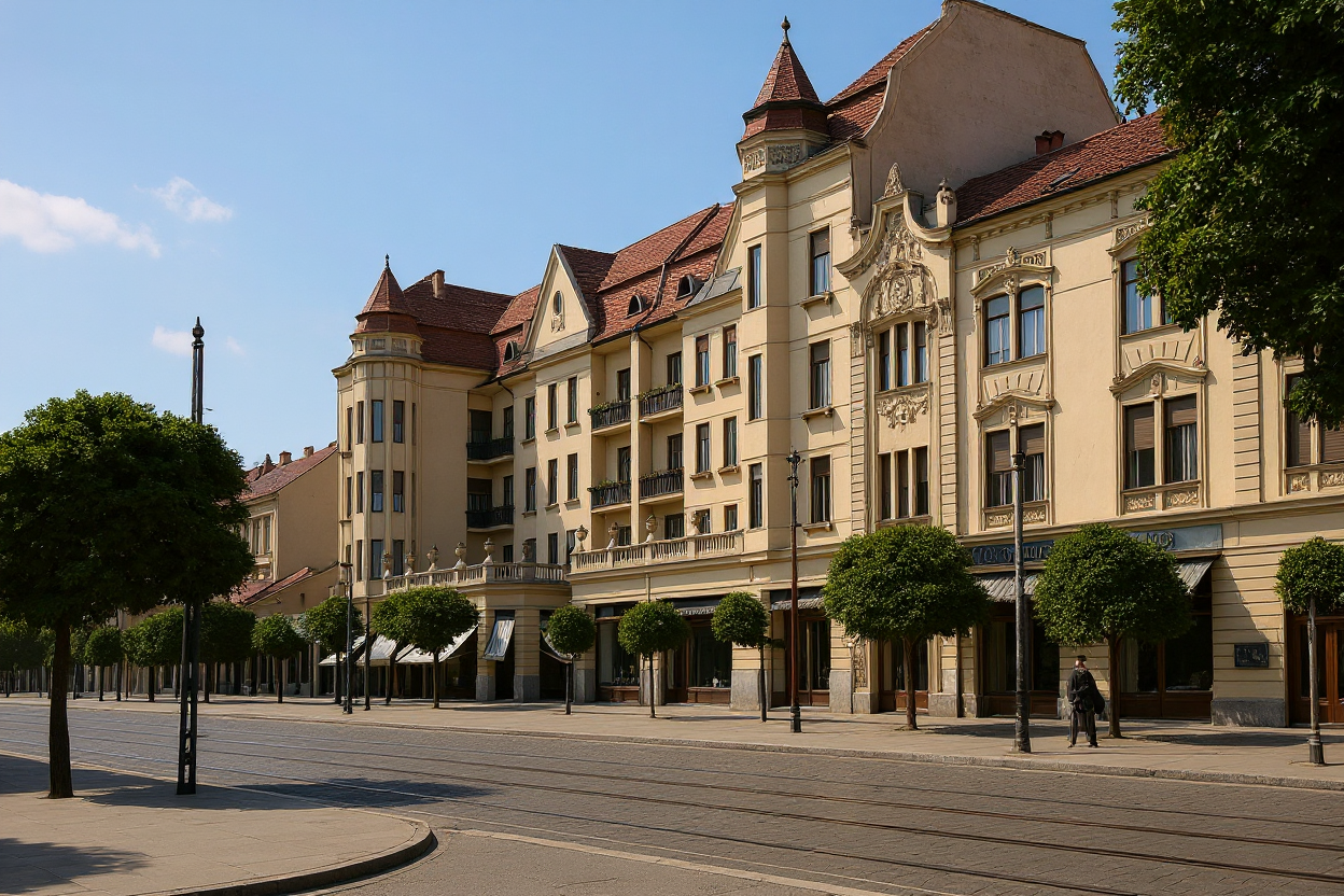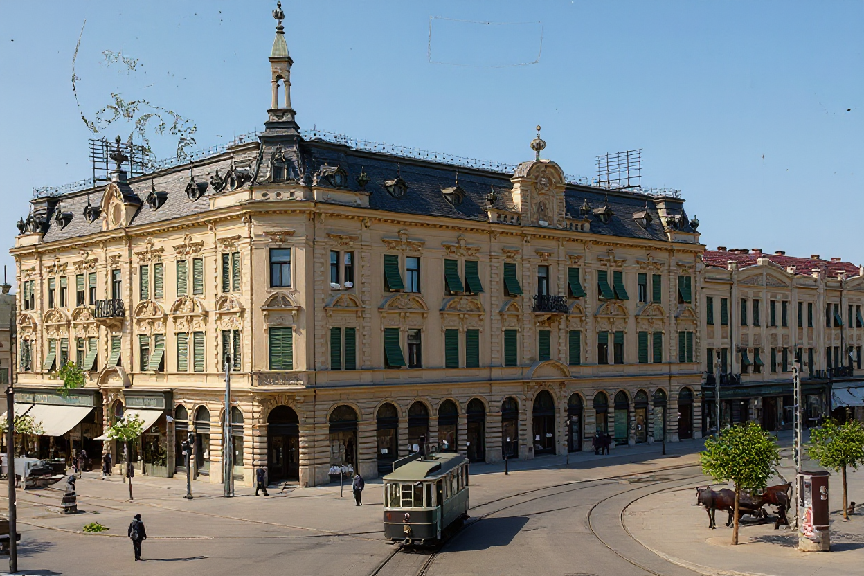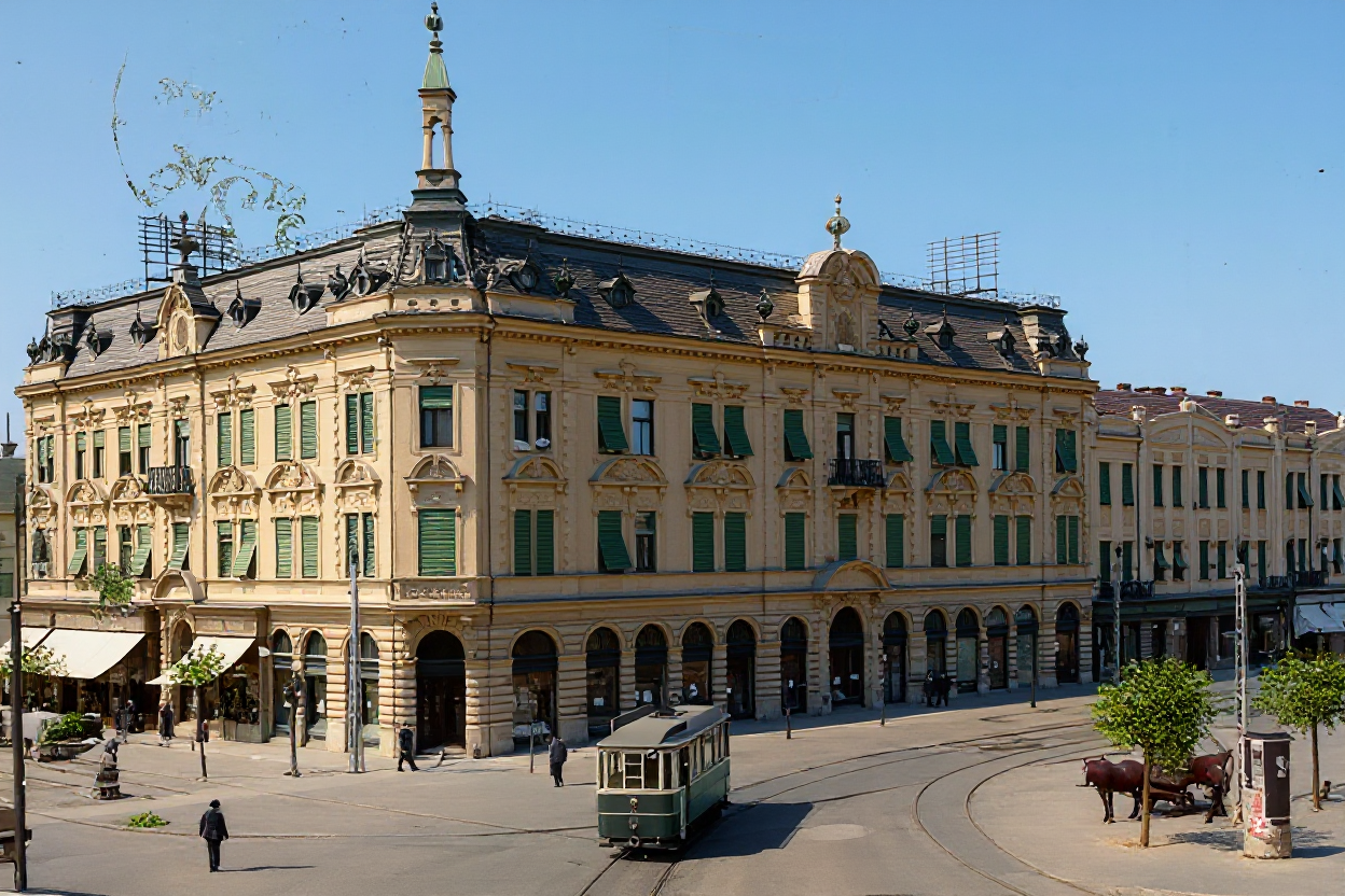 sunny day stucco restored fassade with details remove text from bottom of the picture black tram on track