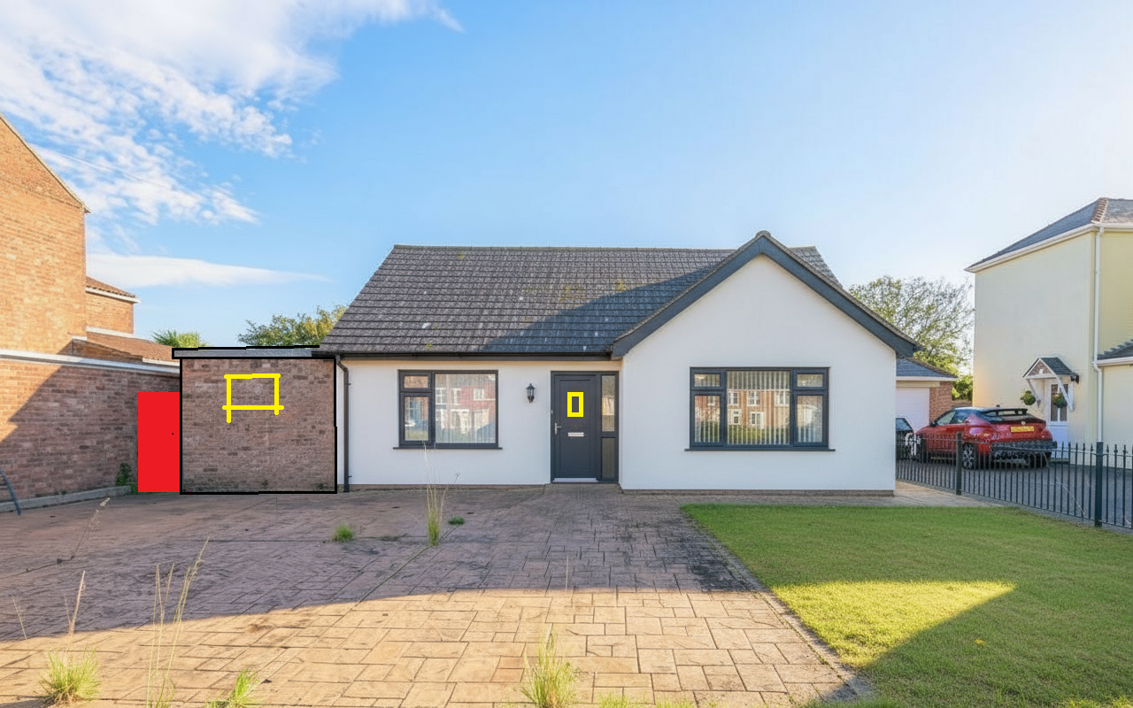 add small bathroom window where marked in yellow add a new close boarded timber gate where marked in red and change all the walls to white rendered finish keep the railings as black keep everything else the same as the source image