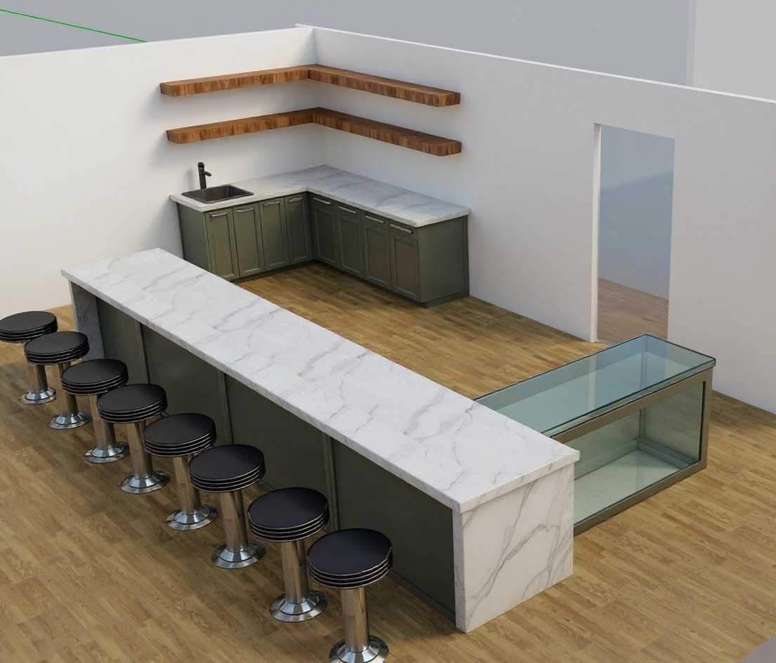 make the sides of the countertop wood cabinet panels to match the other cabinets remove the marble at the waterfall make the floating shelves light walnut