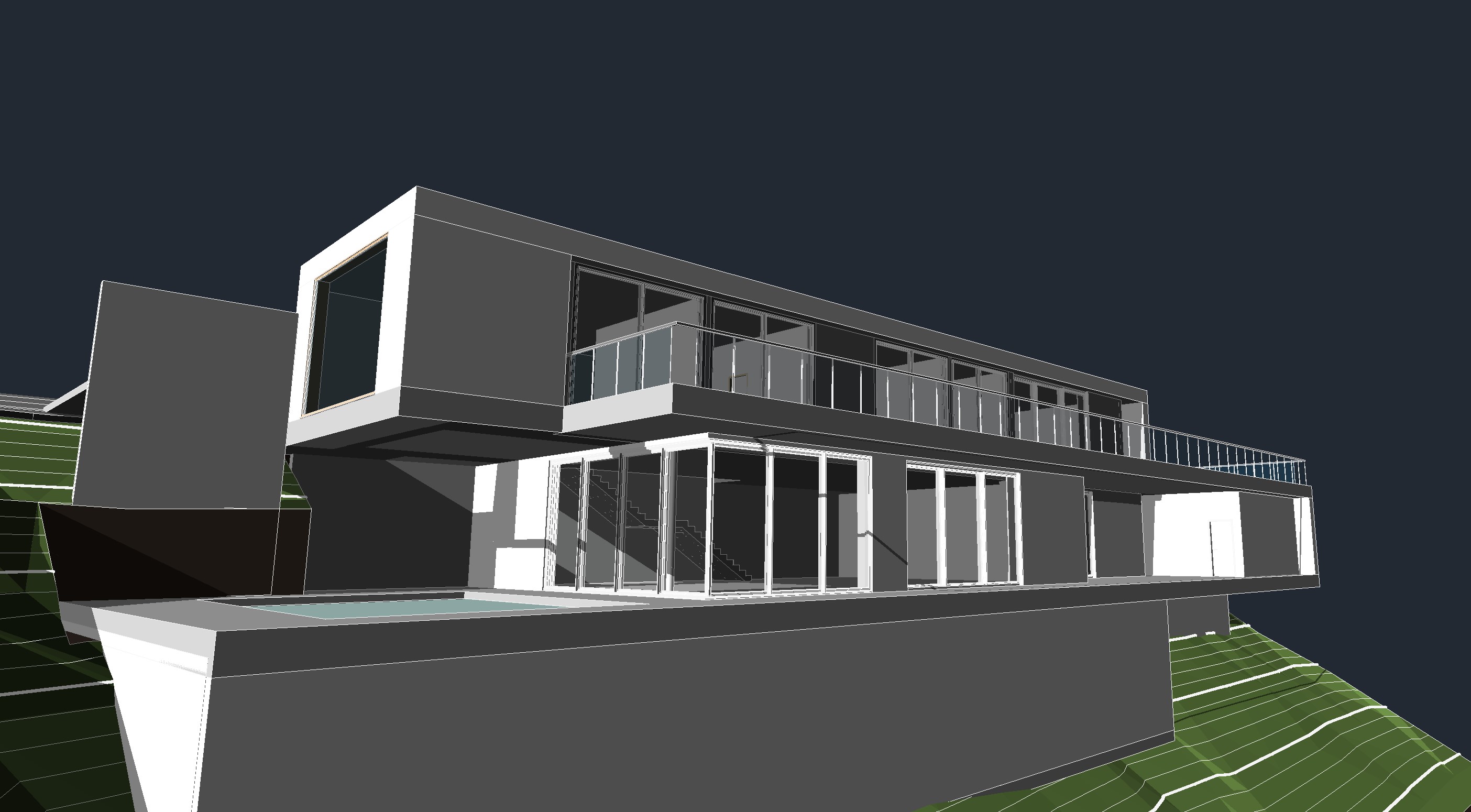 large modern theme house in pacific palisades ca expansive glass sliding doors smooth white stucco and travertine stone accents with outdoor living spaces with frameless glass railings and surrounded by olive trees overlooking the pacific ocean
